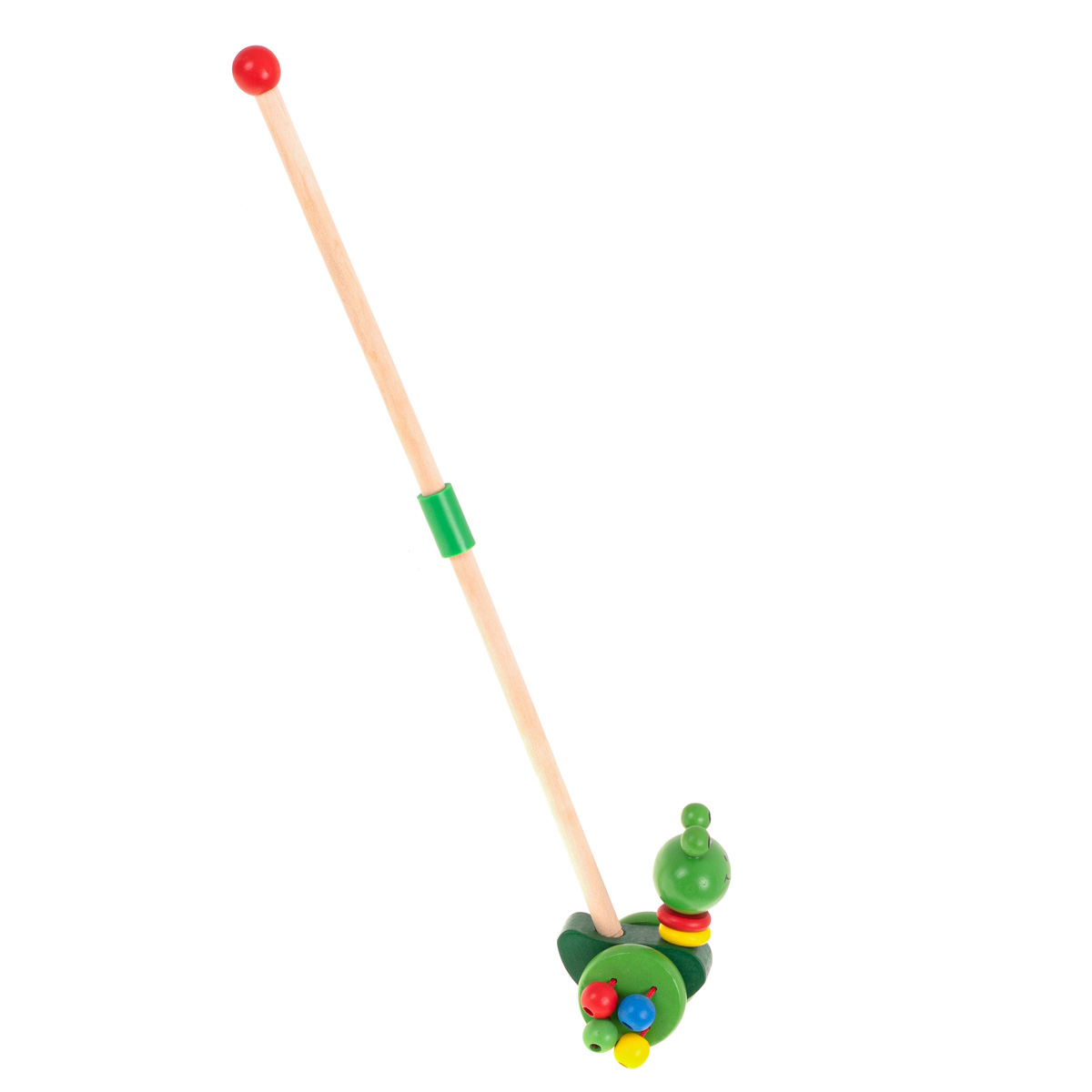 Pchacz na kiju dla dzieci żabka. Kolorwa zabawka wykonana w całości z drewna z dbałością o każdy szczegół. Doskonały kompan dziecka podczas spacerów. Zabawką można bawić się również bez prowadnika. Dł. kija: 46cm Wymiary żabki: 8×6,5×11,5cm