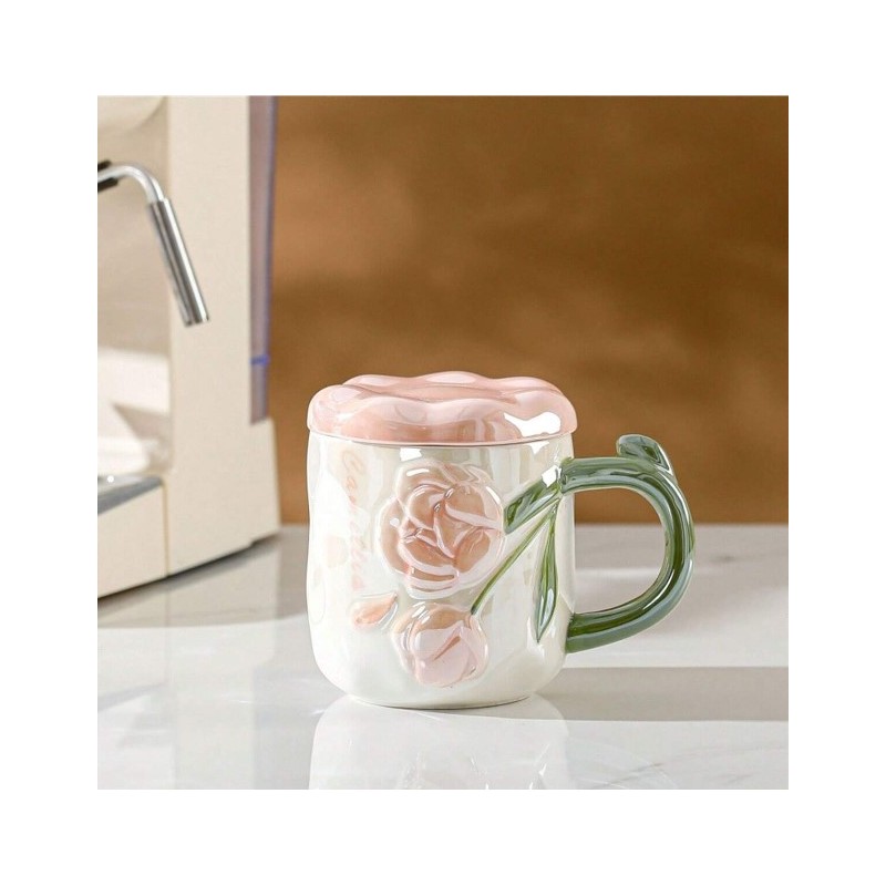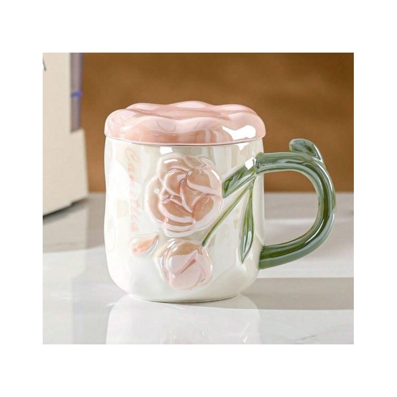 Perłowy Kubek z Pokrywką 450 ml Róże + Pudełko na Prezent KB02R