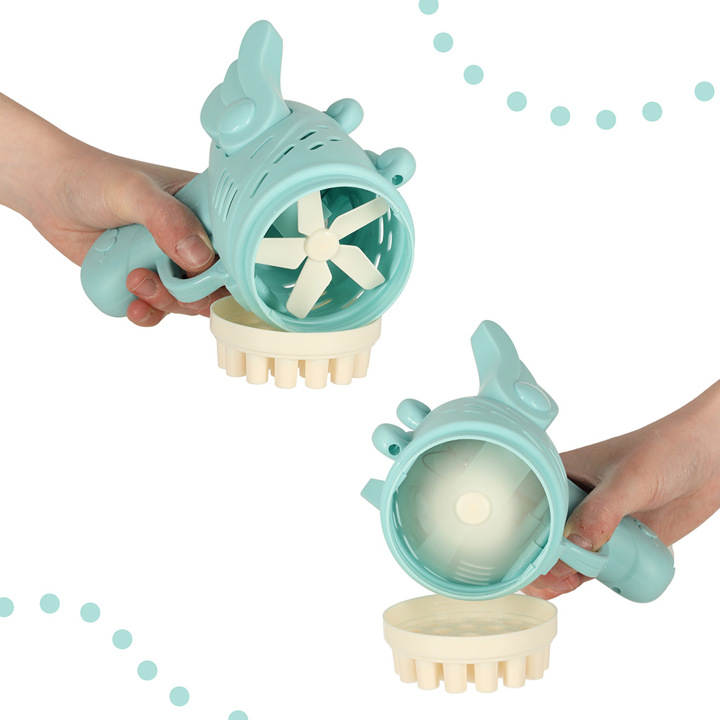 Niebieski pistolet do baniek mydlanych – dzięki niemu puszczanie mydlanych bąbelków będzie niezwykle łatwe, szybkie i przyjemne. W zestawie dodatkowo pojemnik z płynem i miseczka. Tworzywo: plastik. Wiek: 3+. Wymiary: 15,5 cm x 15 cm x 7,5 cm.