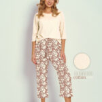 Damska piżama łącząca wygodę i styl. Bluzka z długim rękawem ma dekolt półokrągły oraz uroczy napis, który dodaje jej wyjątkowego charakteru. Luźny, komfortowy krój oraz miękka, przewiewna tkanina zapewniają maksymalny komfort. Spodnie z nadrukiem, długie i bez kieszeni, są doskonałym uzupełnieniem kompletu. Elastyczna gumka w pasie oraz wiązanie za pomocą tasiemki gwarantują idealne dopasowanie i wygodę noszenia. Piżama idealnie pasuje do innych produktów z tej samej kolekcji, tworząc harmonijny i stylowy zestaw na każdą noc.