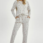 Klasyczna piżama damska idealna na chłodniejsze wieczory i poranki. Bluzka z długim rękawem i okrągłym dekoltem została uszyta z miękkiej, przewiewnej tkaniny, która delikatnie otula ciało, zapewniając komfort przez całą noc. Długie spodnie ozdobione subtelnym wzorem posiadają praktyczne kieszenie, szeroką gumę w pasie oraz troczki, które pozwalają na idealne dopasowanie do sylwetki. Całość zapakowana w foliowy woreczek, świetny wybór zarówno na co dzień, jak i jako prezent.