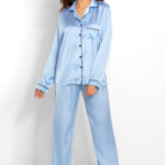 Piżama damska składająca się z bluzki i długich spodni. Bluzka z rękawem 3/4, na przodzie kieszonka. Długie spodnie o luźnym, komfortowym kroju. Komplet idealny również jako homewear.