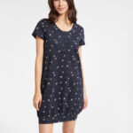 Krótka bawełniana piżama damska BUZZY to lekka, dziewczęca propozycja na lato. Górną część zestawu stanowi koszulka typu T-shirt w kolorze granatowym. Ma ona luźny krój i krótkie rękawki z zakładkami, sięgające do połowy ramienia. Z przodu ozdobiona jest kaligrafowanym napisem Take your time w tęczowych kolorach ombre. Dolna część kompletu to krótkie spodenki w kolorowe, pionowe paski. Przy końcach nogawek znajdują się szerokie zakładki, natomiast w pasie wszyto praktyczną gumkę. Sięgnij po ten model, jeżeli lubisz dwuczęściowe komplety do spania, wykonane z naturalnych, oddychających materiałów. Tego rodzaju bielizna nocna stanowi również wspaniały pomysł na prezent dla bliskiej osoby!