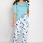 Piżama damska składająca się z bluzki oraz spodni. Bluzka z rękawem 3/4, o luźnym komfortowym kroju. Długie spodnie z nadrukiem, w pasie ozdobna kokardka.