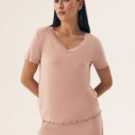 Damska piżama dwuczęściowa to zestaw, który pozwoli Ci połączyć modę oraz komfort. Górną część kompletu stanowi musztardowa bluzka z długim rękawem. Dolną część zestawu stanowią spodnie z luźnymi nogawkami oraz gumą w pasie.