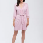 Śliczna, kobieca, dwuczęściowa piżama Iris z bluzeczką w kropeczki i gładkimi spodniami. Góra z krótkim rękawem, V-dekoltem z przodu i na plecach i kokardką. Spodnie w różowym kolorze (piękny odcień pudrowego różu). Fenomenalna propozycja właściwie dla każdej kobiety.