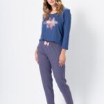 Damska piżama, która doskonale sprawdzi się zarówno jako nocny strój, jak i stylowy homewear. Góra z półokrągłym dekoltem i długimi rękawami, wykończonymi ściągaczami, zapewnia luźny i komfortowy krój. Kieszenie po bokach dodają funkcjonalności. Wykonana z miękkiej i przewiewnej tkaniny z nadrukiem, piżama gwarantuje wygodę przez cały dzień. Długie spodnie wykończone ściągaczami, z elastyczną gumką w pasie i troczkami do regulacji, idealnie dopasowują się do sylwetki, zapewniając komfort noszenia. Idealny wybór na każdą porę dnia.
