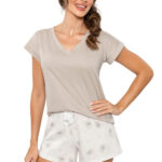Damska piżama o wyjątkowo komfortowym kroju, idealna zarówno do spania, jak i do noszenia w domowym zaciszu jako homewear. Bluzka posiada długie rękawy zakończone ściągaczem oraz dekolt w kształcie litery V, co nadaje jej eleganckiego charakteru. Bluzka również wykończona jest ściągaczem, a dodatkowo ozdobiona na przodzie napisem, który podkreśla jej stylowy wygląd. Spodnie są długie, zdobione subtelnym nadrukiem, bez kieszeni, co zapewnia lekkość i wygodę. W pasie umieszczona jest elastyczna gumka, a ozdobna kokardka dodaje całości uroku. Produkt wykonany w Polsce, gwarantujący wysoką jakość i wygodę.