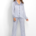Damska piżama zaprojektowana i uszyta w Polsce to elegancja i komfort w jednym. Zestaw składa się z koszuli z długim rękawem oraz długich spodni. Koszula ma dekolt typu V, kołnierz, rękawy wykończone mankietami, luźny krój typu oversize i jest zapinana na guziki. Spodnie również mają luźny, wygodny krój i gumkę w pasie. Wykonana z naturalnych materiałów, piżama pozwala skórze oddychać. Wysoka jakość wykonania zapewnia trwałość. Należy unikać suszenia w suszarkach bębnowych. Delikatna, elegancka stylistyka sprawia, że jest idealna także na prezent.