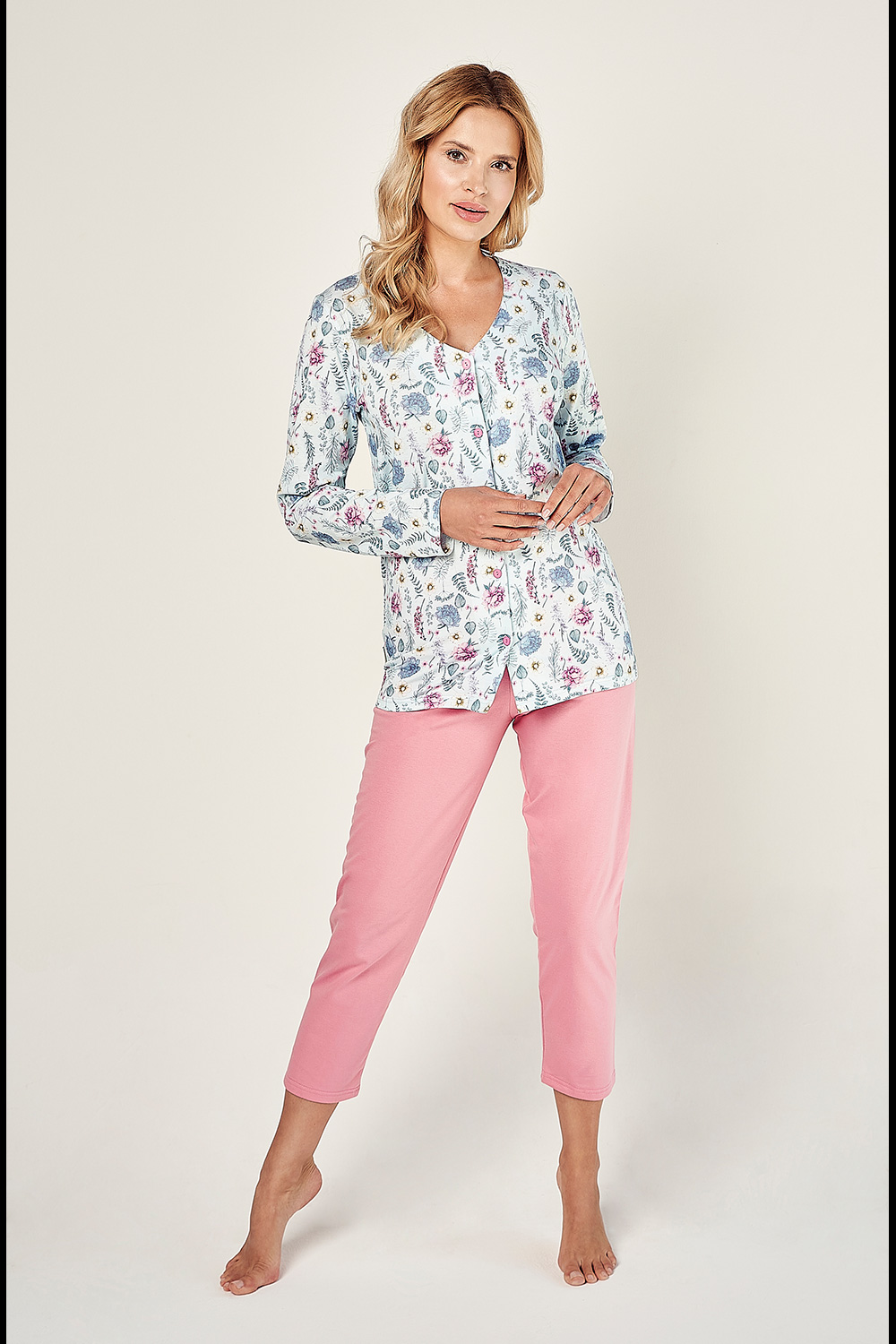 Piżama damska o komfortowym kroju, uszyta z wysokiej jakości bawełny. Koszula zapinana na guziki z długim rękawem. Do kompletu gładkie spodnie typu rybaczki w jednolitym kolorze.