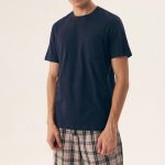 Letnia piżama męska składająca się z koszulki i spodenek. Koszulka z miękkiej dzianiny bawełnianej, z krótkim rękawem. Spodenki z delikatnej tkaniny w kratkę, w pasie wiązany troczek.