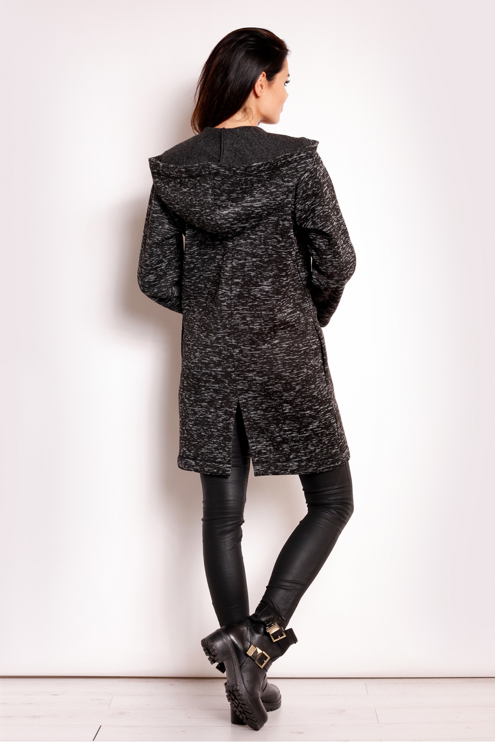 Nietuzinkowy płaszcz wykonany z miękkiej dzianiny z długim rękawem o prostym fasonie. Oryginalny krój sprawia że model pięknie się układa luźno opadając. Szeroki kołnierz, kaptur oraz głębokie kieszenie. Model zapinany na ekspresowy zamek. Niezwykle elegancka propozycja, która doda niebanalności każdej stylizacji.