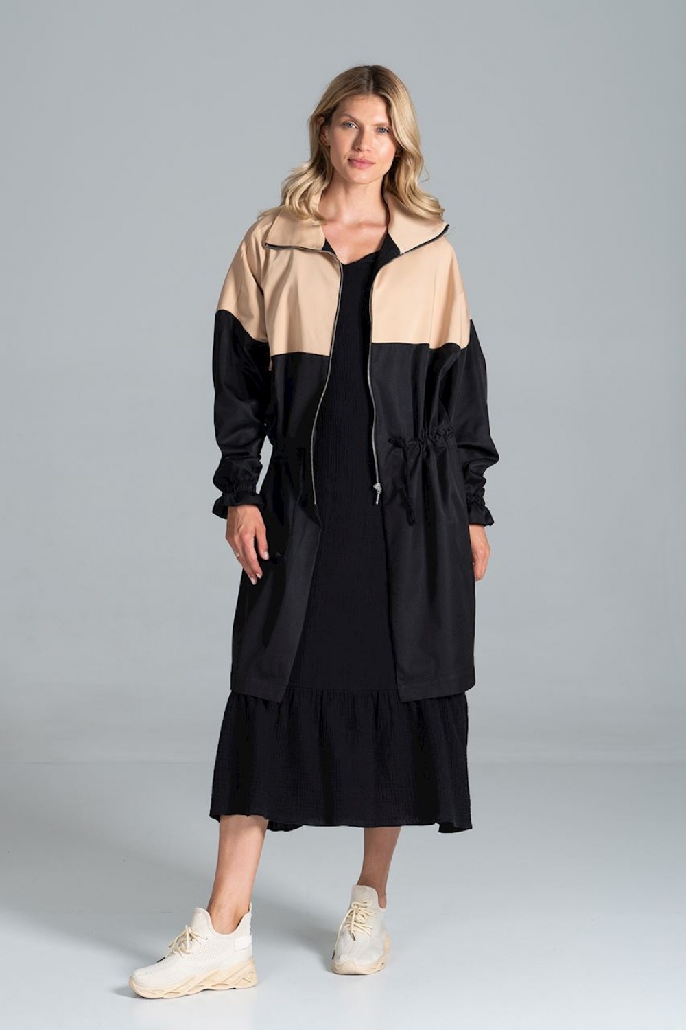 Dwukolorowy jesienny płaszcz typu parka, zapinany częściowo na zamek, z kołnierzem, w pasie ściągany dodatkowo sznurkiem, rękaw marszczony wszytą gumką, kieszenie w bocznych szwach, bez podszewki.
