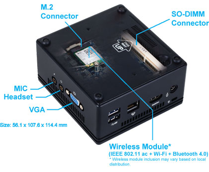 Platforma posiada zainstalowany procesor Intel® Celeron® N3000, moduł Wi-Fi oraz Bluetooth. Do uruchomienia wymagana jest pamięć SO-DIMM DDR3 Low Voltage (1.35V), dysk 2.5″ HDD/SSD oraz system operacyjny. Posiada złącze HDMI oraz D-Sub, więc można podłączyć ją do monitora lub telewizora wyposażonego w jedno z tych złącz.