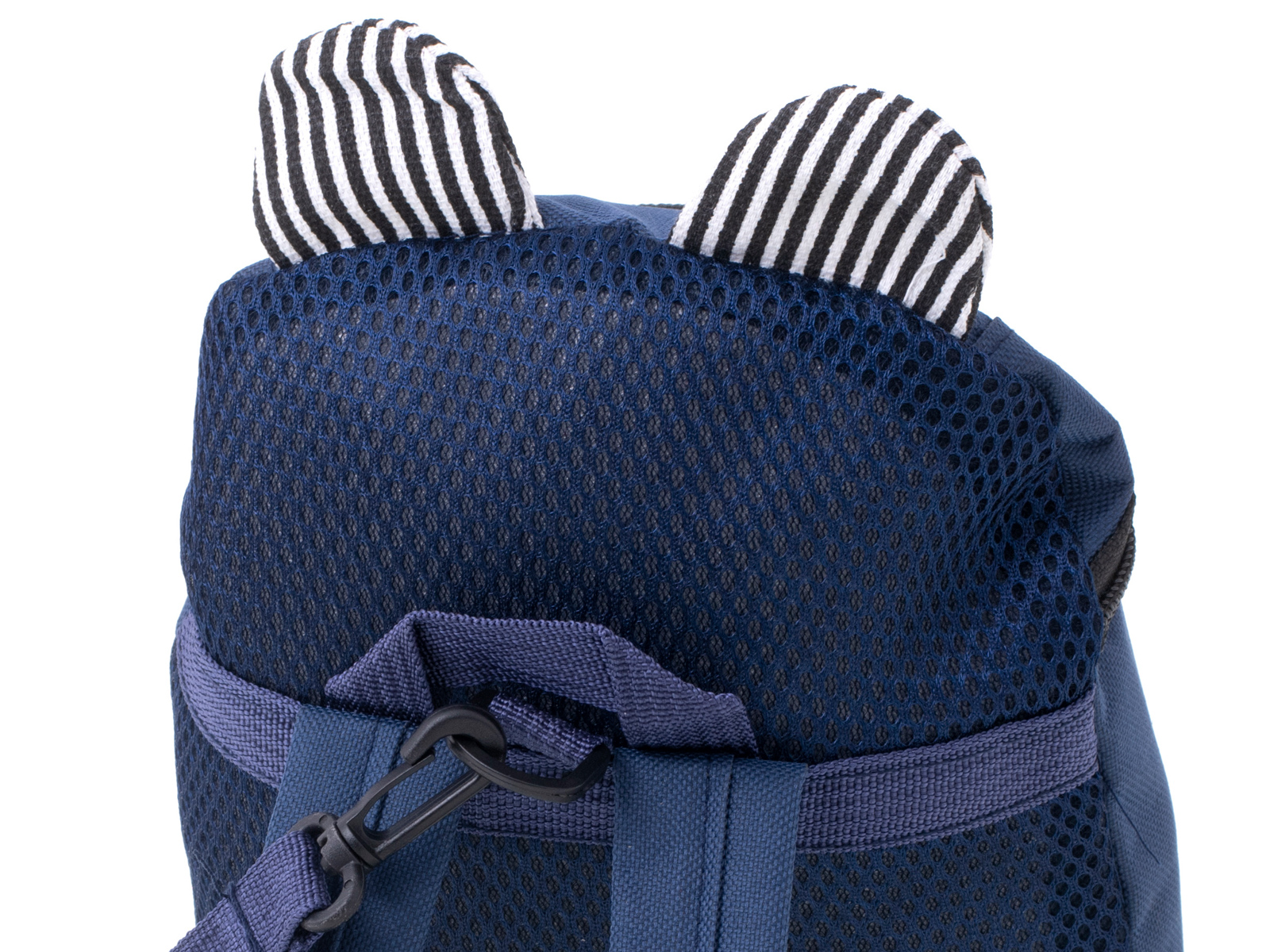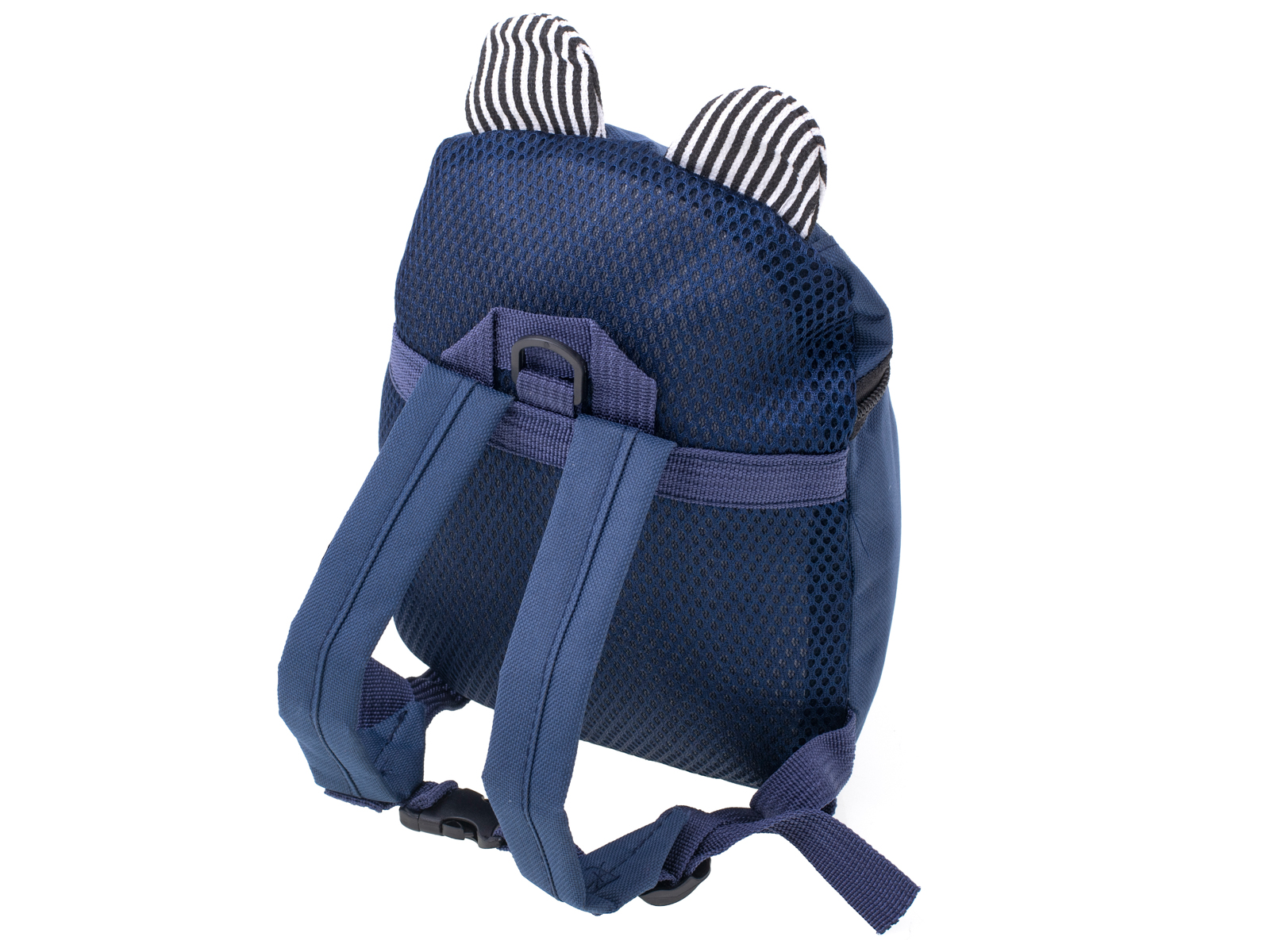 Nieduży granatowy plecak w kształcie misia. Jedna kieszeń zapinana na zamek błyskawiczny pomieści najpotrzebniejsze rzeczy. Regulowane szelki i uchwyt zapewnią wygodę, a praktyczna smycz – bezpieczeństwo. Wykonany z poliestru. Wymiary: 27x21x11cm.