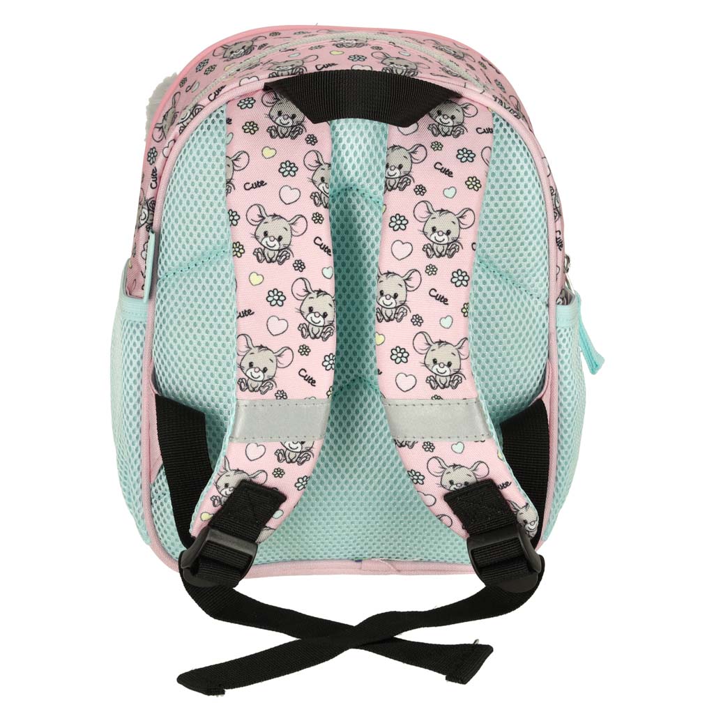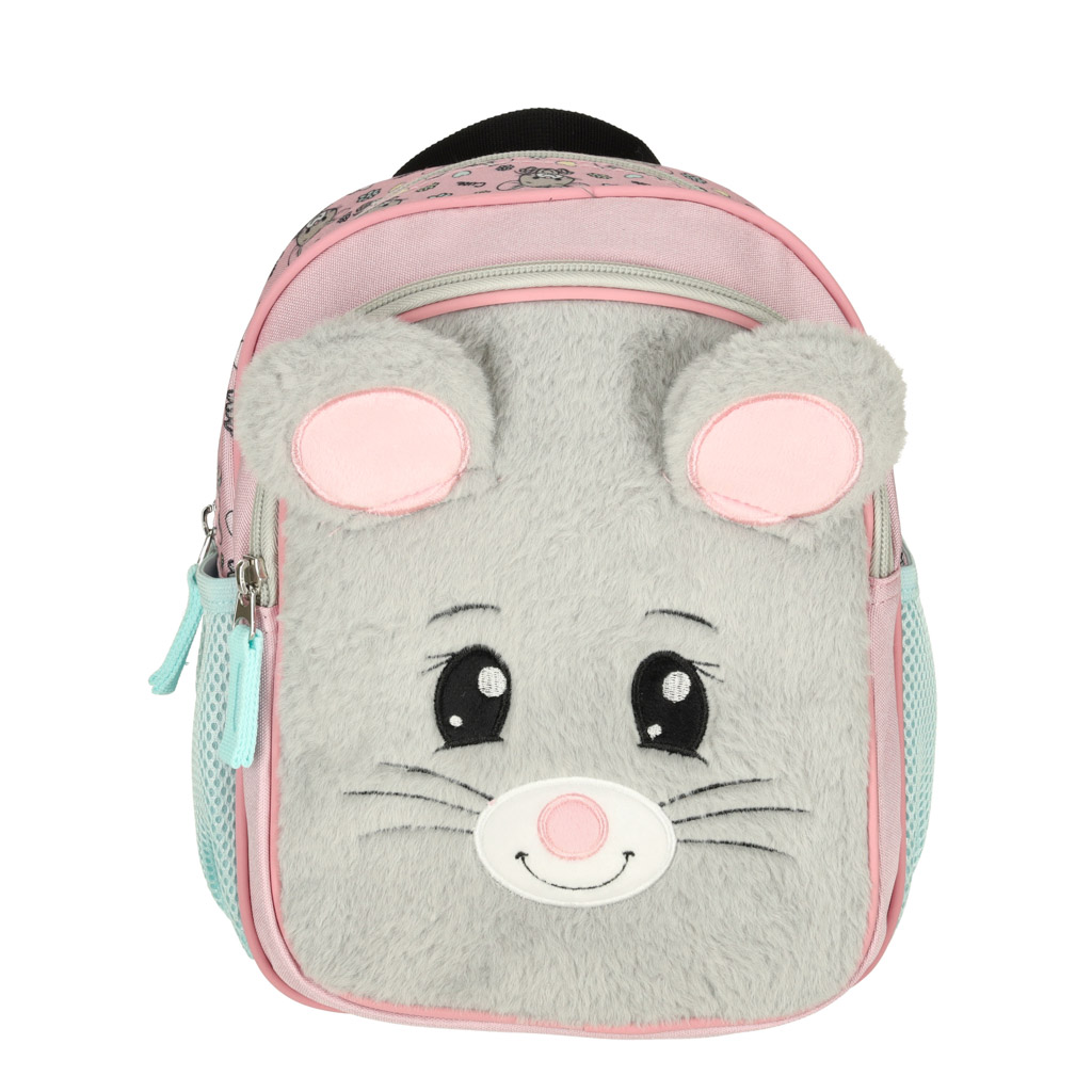 Plecak myszka dla przedszkolaka. Z przodu jest obszyty miłym w dotyku sztucznym futerkiem. Ma szerokie szelki z odblaskami oraz miękkie wypełnienie z siateczką z tyłu, przez co plecak nie obciąża dziecka. Wymiary: 27 cm x 21 cm x 12 cm, kolor: mix