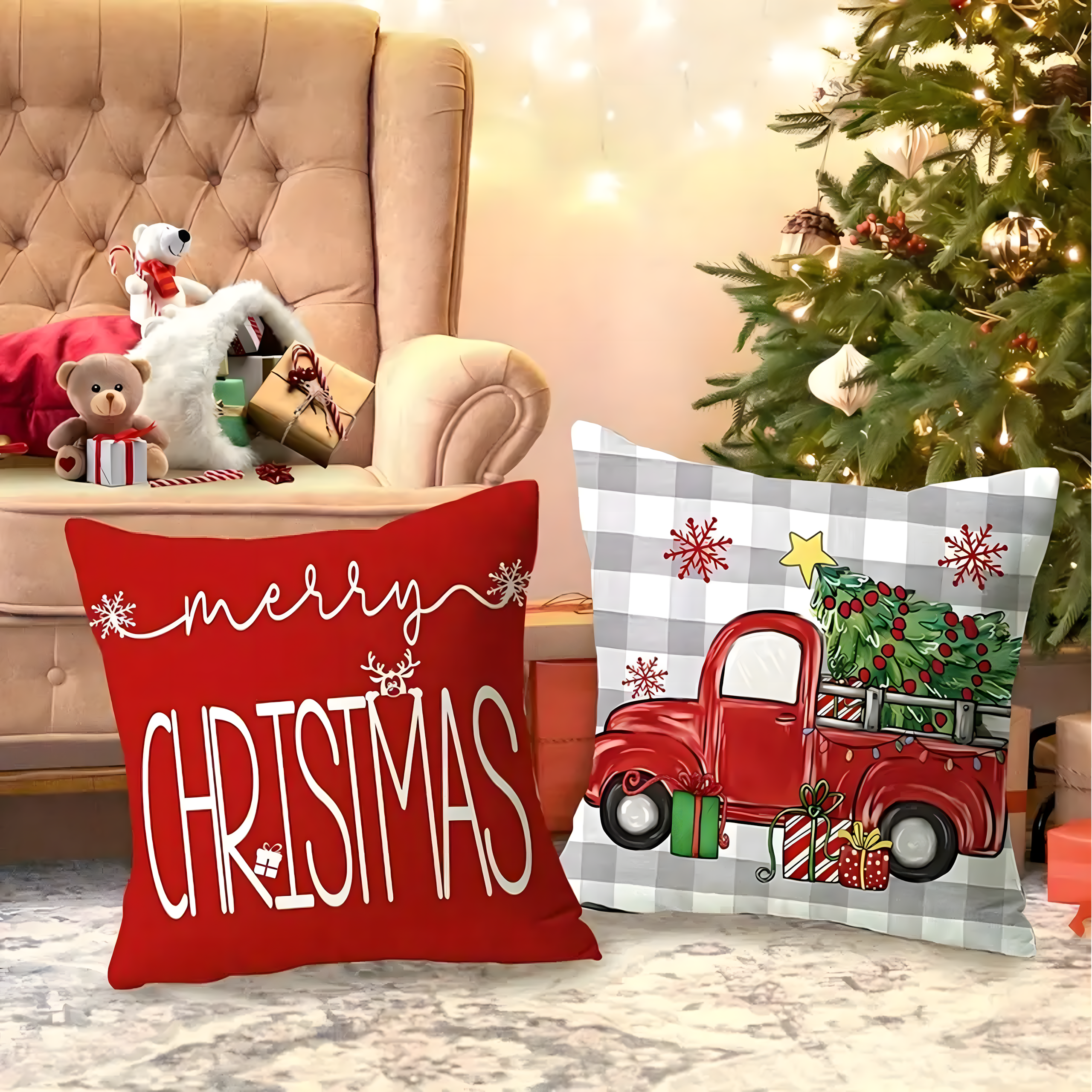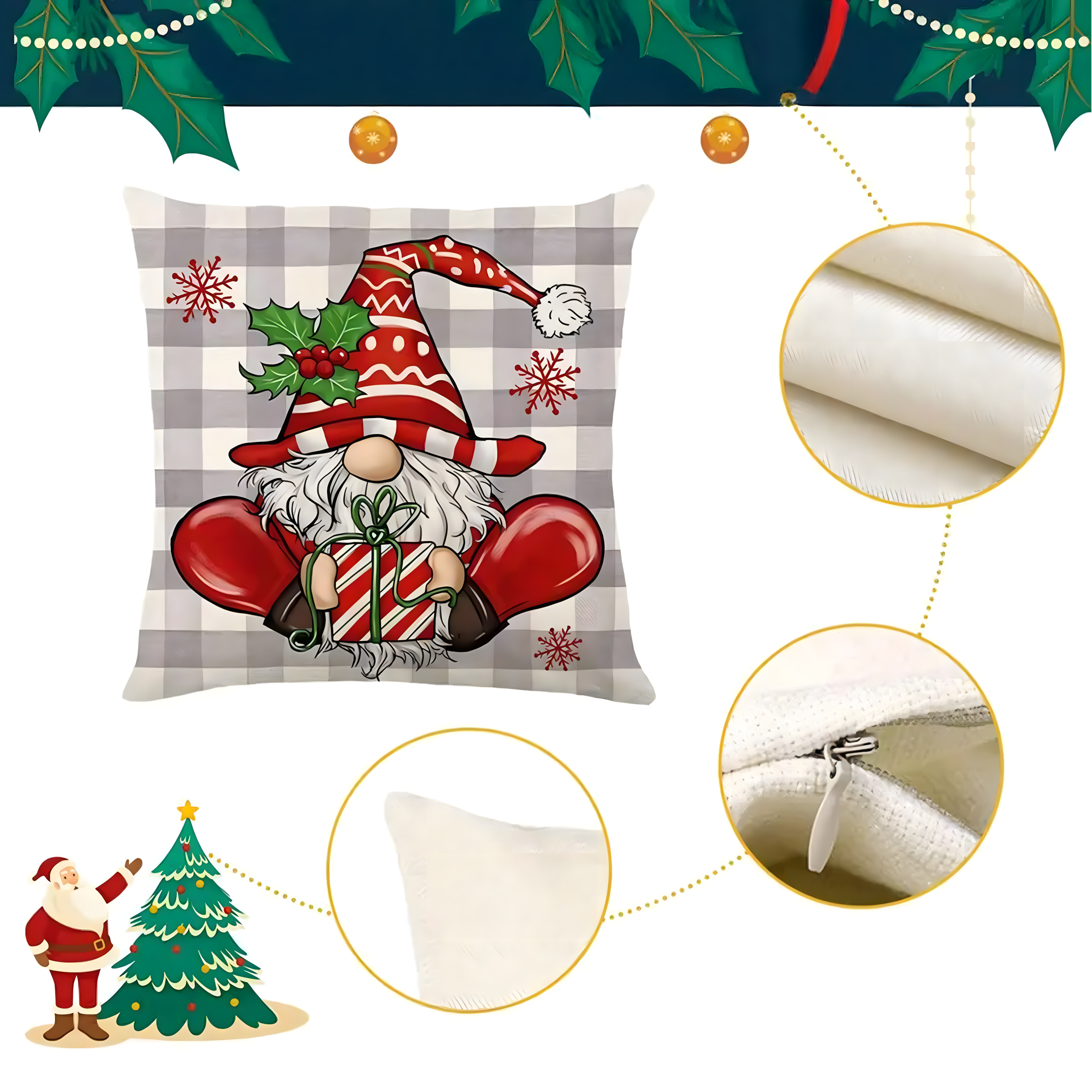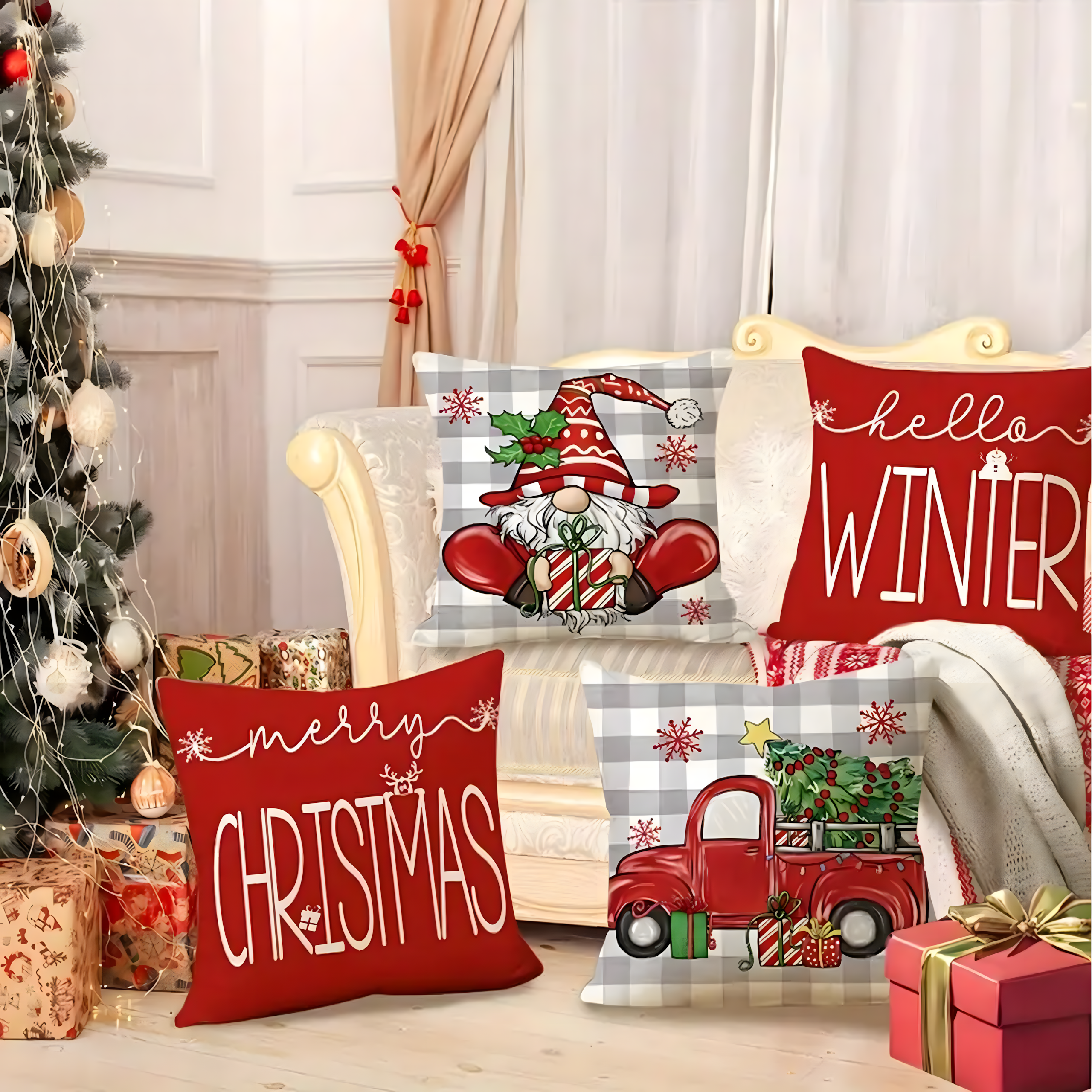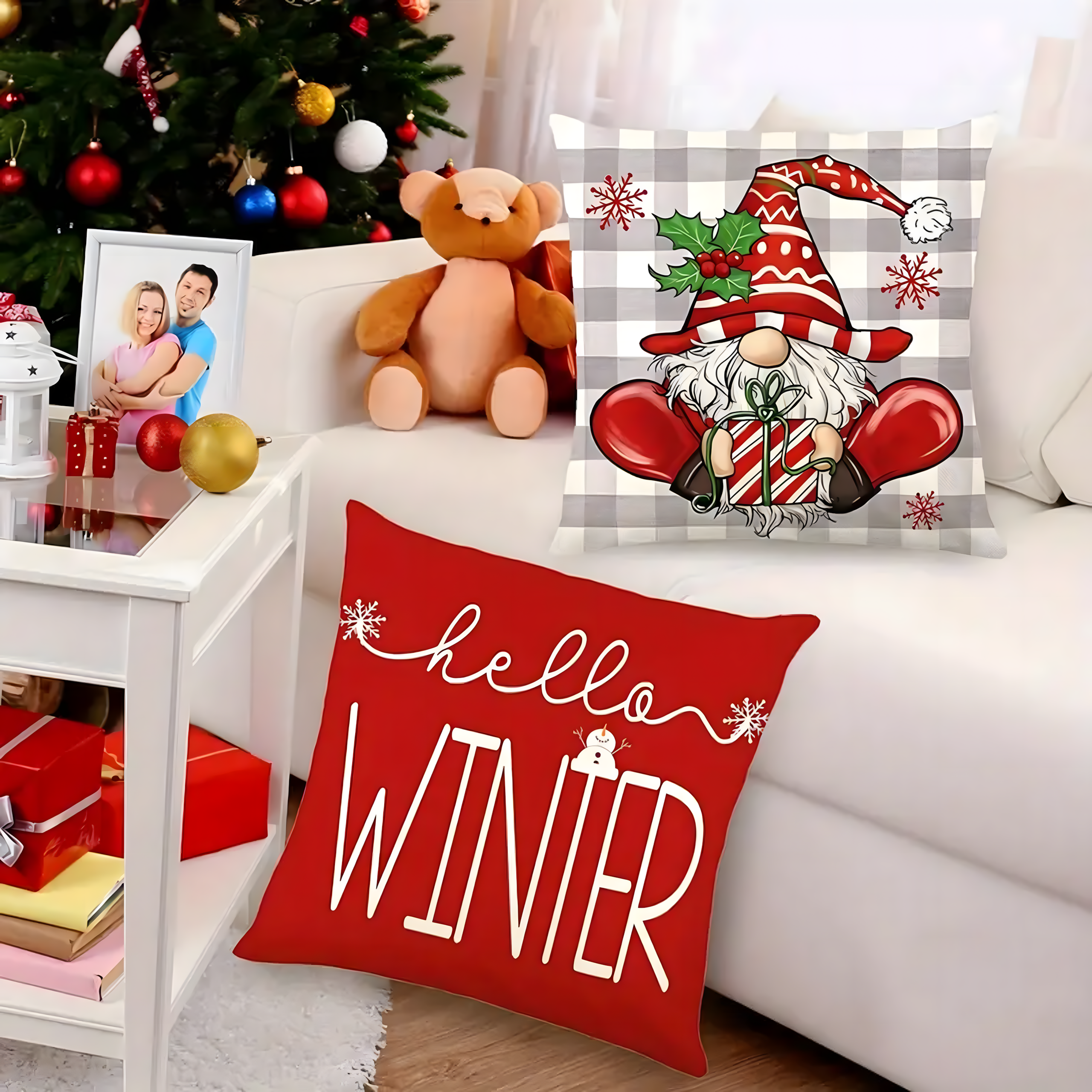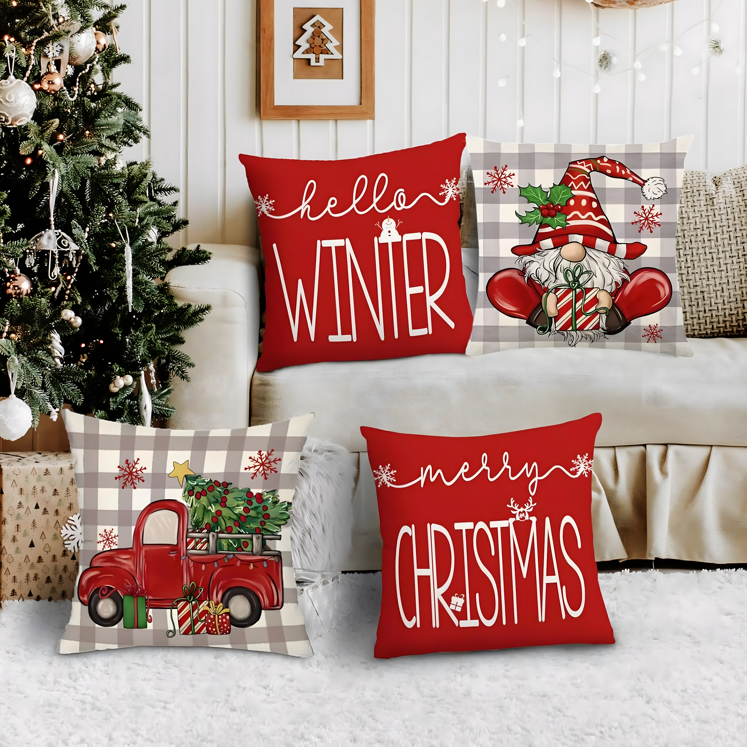 Zestaw 4 dekoracyjnych poszewek świątecznych 45×45 cm to prosty i efektowny sposób, aby wprowadzić do domu magię Świąt. Wykonane z wysokiej jakości materiału imitującego len, są trwałe, przyjemne w dotyku i łatwe w pielęgnacji. Urocze wzory z motywem świątecznym, napisami „Christmas” i „Winter” nadadzą Twojemu wnętrzu przytulności i wyjątkowego charakteru.