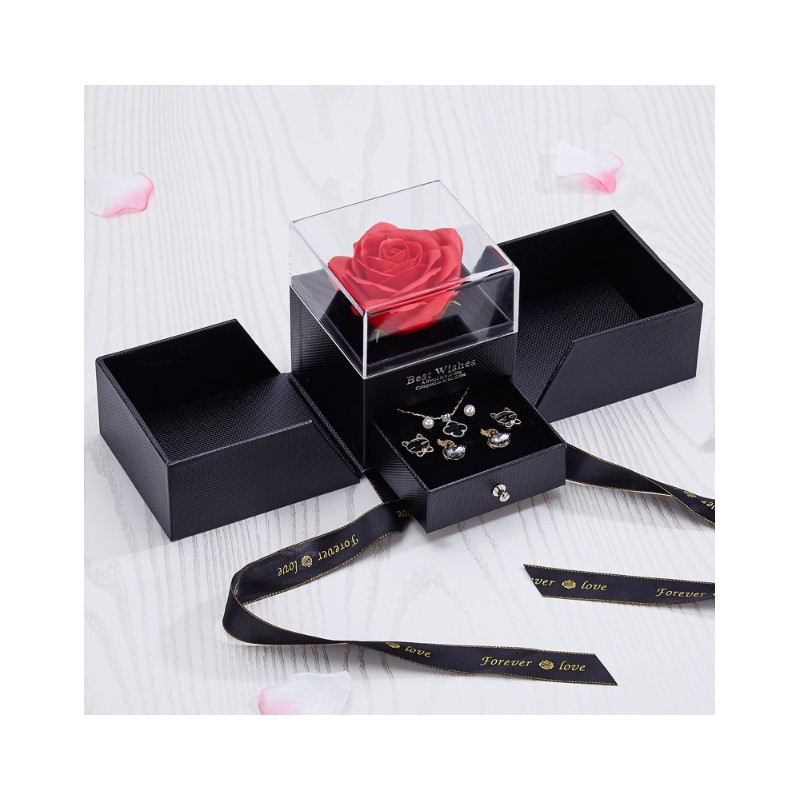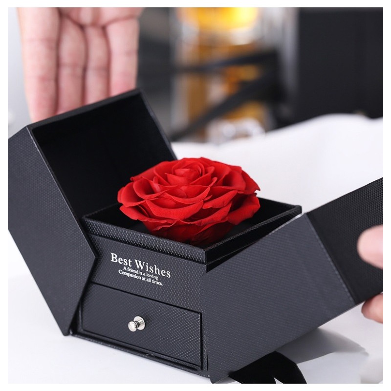 Pod przeźroczystą osłonką znajduje się czerwona mydlana róża. Pudełeczko posiada wysuwaną szufladkę na biżuterię. Wymiary pudełeczka: