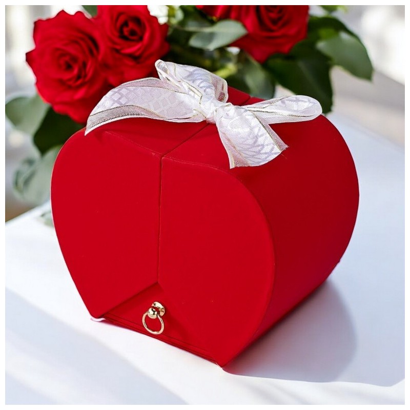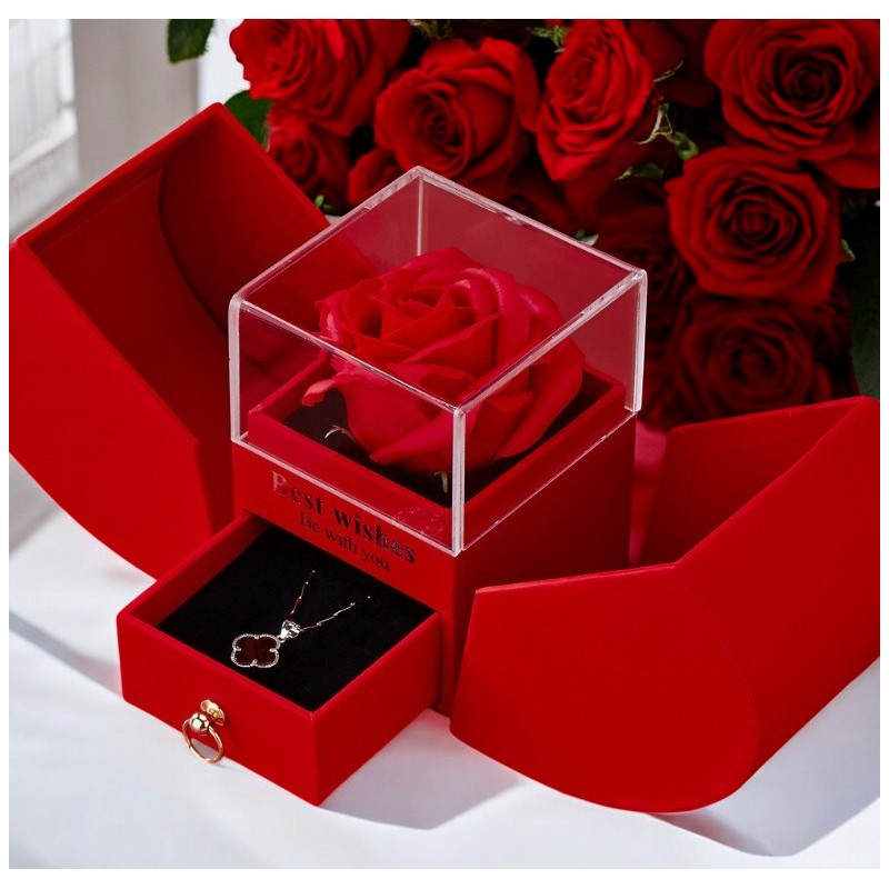 Pod przeźroczystą osłonką znajduje się czerwona mydlana róża. Pudełeczko posiada wysuwaną szufladkę na biżuterię. Wymiary pudełeczka: