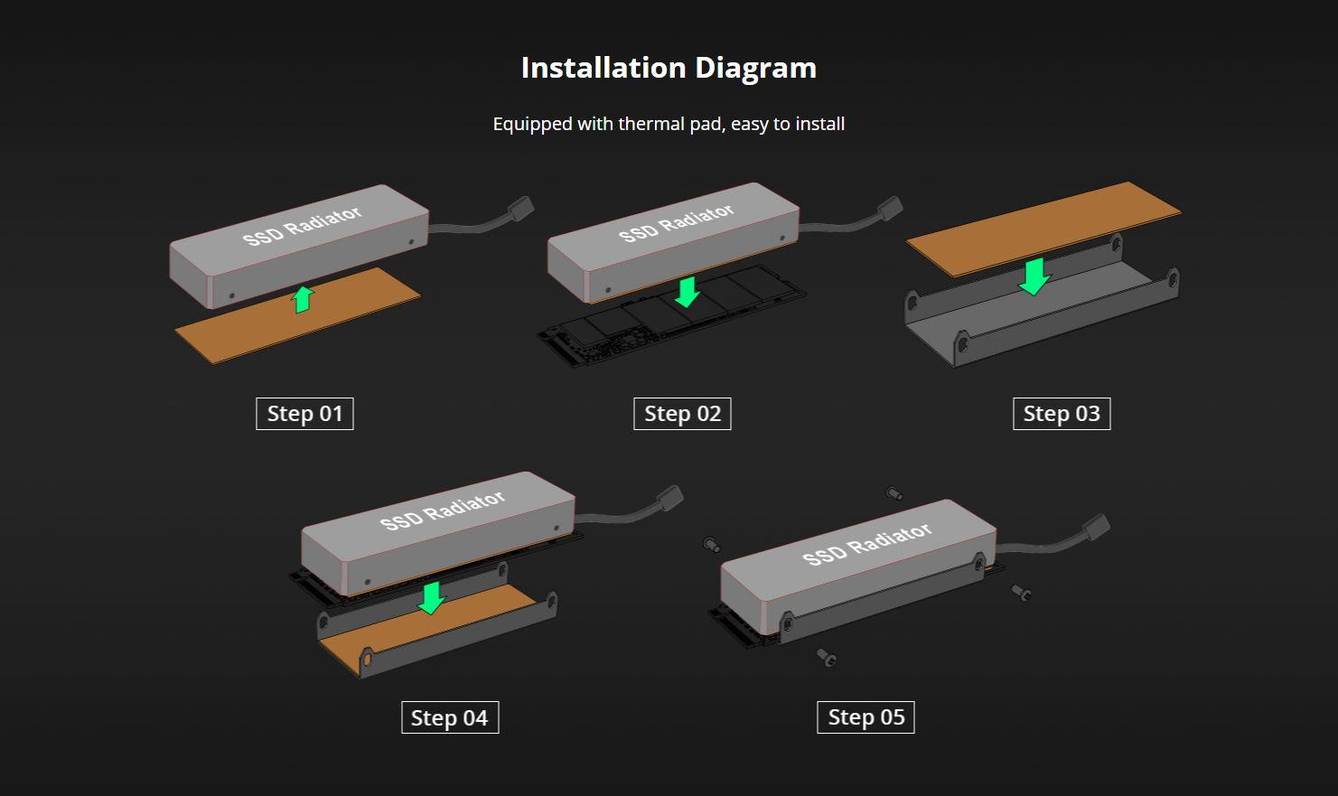Radiator wykonany ze stopu aluminium. Wyposażony w dwa ciche wentylatory, skutecznie odprowadza nadmiar ciepła z dysku M.2 o maksymalnie 30°C, co jest kluczowe, zwłaszcza podczas intensywnych operacji odczytu/zapisu. Elegancka konstrukcja radiatora nie tylko doskonale sprawuje się w roli chłodzenia, ale także nadaje estetyczny charakter wnętrzu komputera. Jego cienka konstrukcja pozwala na łatwą integrację z różnymi konfiguracjami obudowy, a dodatkowo chroni dysk M.2 przed przegrzewaniem, co może wpływać na jego trwałość i wydajność. Instalacja jest prosta i bezproblemowa, a specjalnie zaprojektowany kształt radiatora umożliwia swobodny dostęp do portów M.2 na płycie głównej.