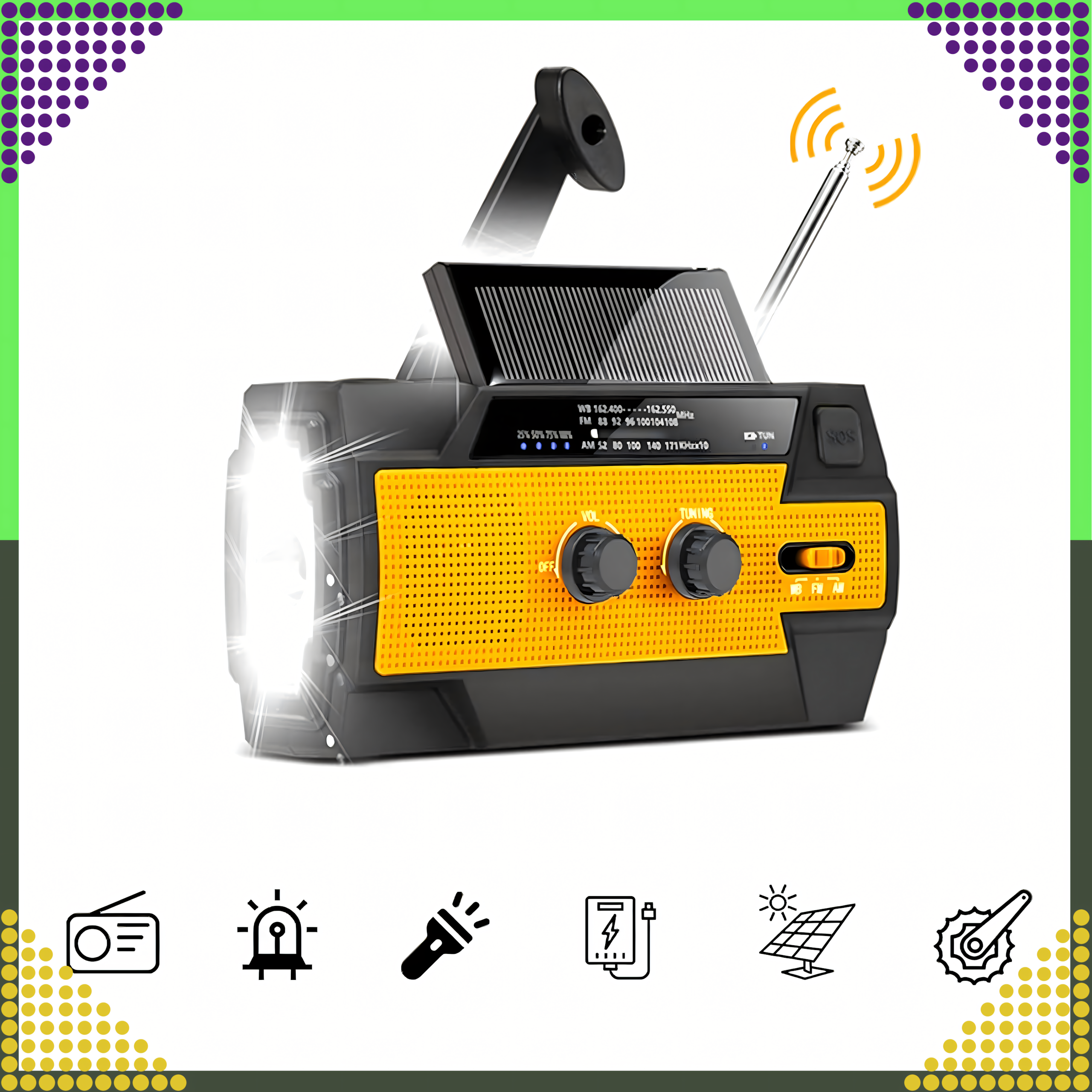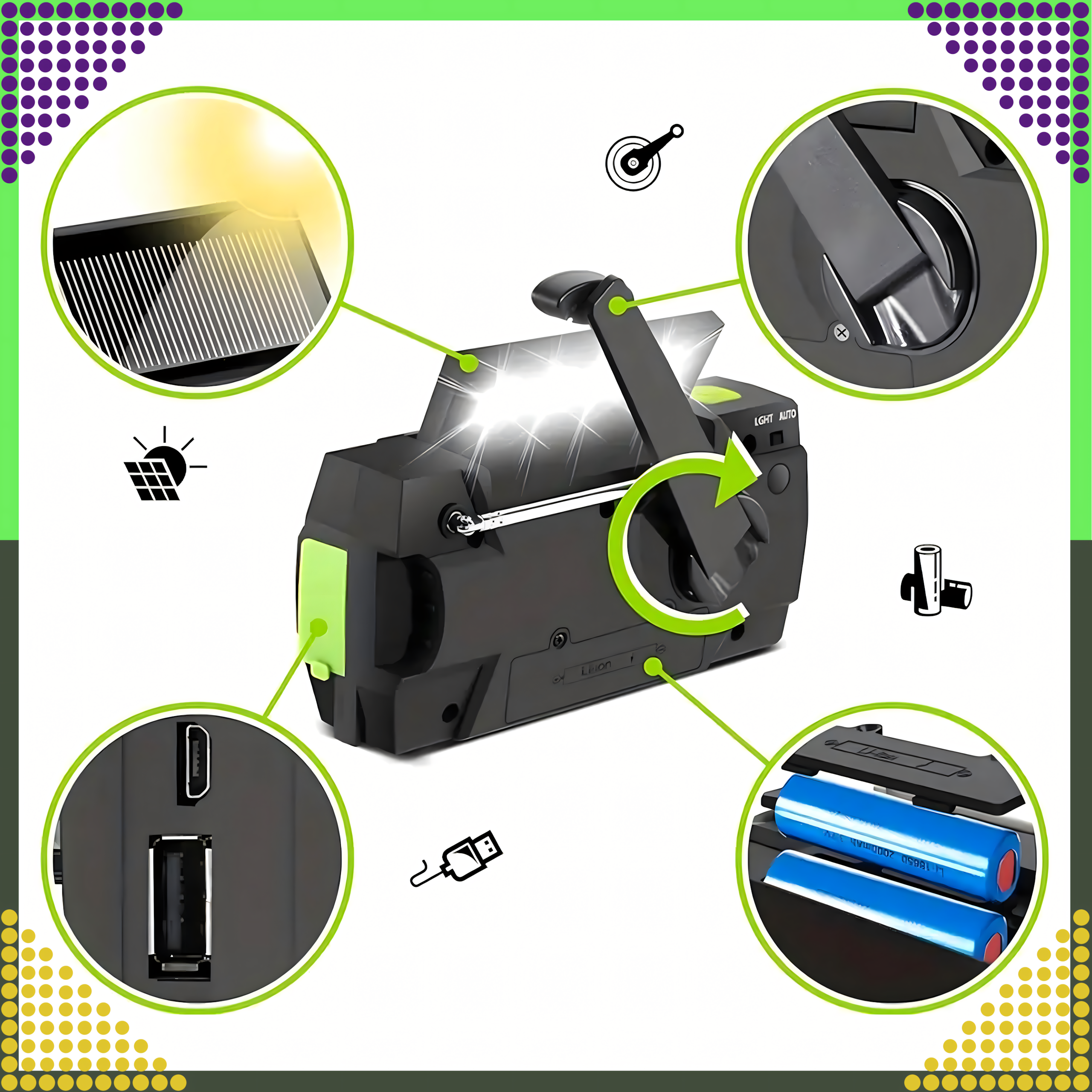 Przygotuj się na każdą sytuację z naszym wielofunkcyjnym, przenośnym radiem awaryjnym! Dzięki połączeniu radia, latarki, powerbanku i funkcji SOS, to urządzenie zapewnia bezpieczeństwo i łączność, gdy tego najbardziej potrzebujesz. Idealne do użytku w domu, podczas kempingu, wędrówek czy w sytuacjach awaryjnych.