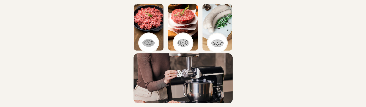 Maszynka do mielenia pozwala na uzyskanie świeżo zmielonego mięsa z różnym stopniem rozdrobnienia. Trzy tarcze umożliwiają mielenie na pasztet, farsz, kotlety czy wędliny. Nakładka do kiełbasy i nakładka do kebbe pozwalają na przygotowanie domowych specjałów z różnych kuchni świata. Mechanizm odblokowywania ramienia umożliwia łatwą wymianę misy i końcówek. Odchylenie ramienia zapewnia lepszy dostęp do misy oraz ułatwia czyszczenie urządzenia.