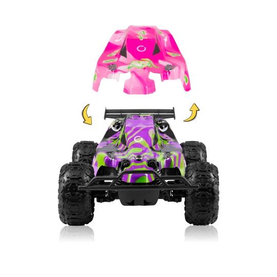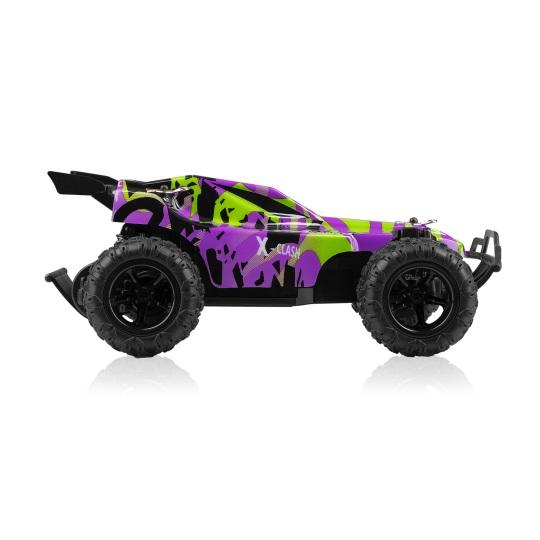 Kontroler, za pomocą którego steruje się X-Clashem, został zaprojektowany w taki sposób, żeby dobrze leżał w dłoni i zapewniał komfort jego użytkownikom. Pilot pozwala na płynną zmianę prędkości oraz skręt kół i umożliwia zastosowanie różnych stylów jazdy. Intuicyjne rozmieszczenie potencjometru przyspieszenia i pokrętła skrętu sprawia, że sterowanie samochodem jest proste i precyzyjne. Samochód RC oferuje wyjątkową możliwość personalizacji dzięki zmiennemu designowi. W zestawie znajdziesz dwie wymienne karoserie. Teraz możesz dostosować wygląd swojego pojazdu do nastroju, stylu lub okazji, zmieniając wygląd w kilka chwil. Karoserie są łatwe do wymiany i zapewniają oryginalność podczas wyścigów i zabawy.