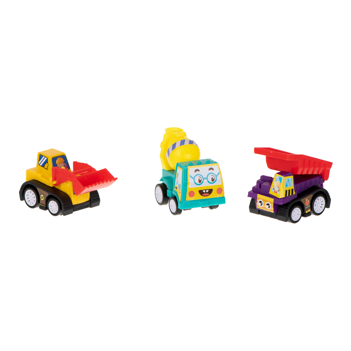 Zestaw samochodów z napędem. Wielokolorowe samochody budowlane posiadają ruchome elementy, które uatrakcyjniają zabawę. Zestaw zawiera m.in betoniarkę, walec. Zapakowane w foliowe opakowanie z zamkiem. Wymiary auta:5x4x3cm (opakowania: 10x11x3cm)
