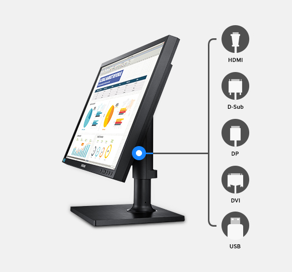 Biznesowe monitory Samsung wyposażone są w najważniejsze porty, niezbędne do komfortowej pracy – DVI i D-Sub.