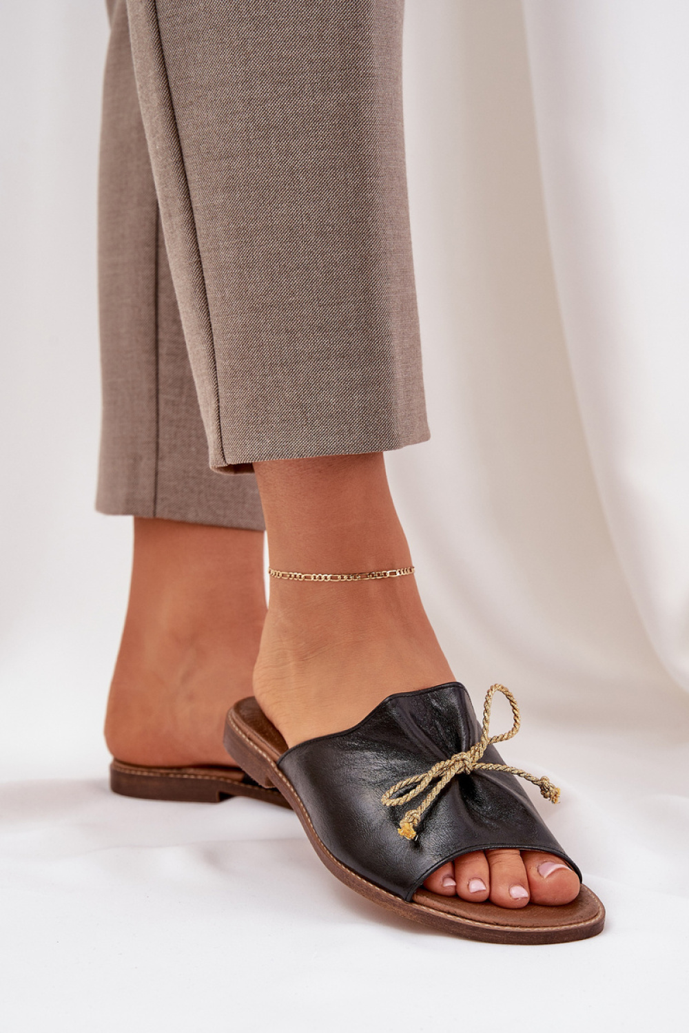 Eleganckie klapki z naturalnej skóry to subtelna propozycja, która łączy wygodę z elegancją. Osadzone na płaskim obcasie, zapewniają komfort przez cały dzień. Delikatne marszczenie na cholewce oraz urocza kokardka dodają im kobiecego uroku. Te klapki będą doskonałym wyborem na letnie dni, idealnie komponując się z lekkimi sukienkami czy casualowymi stylizacjami.