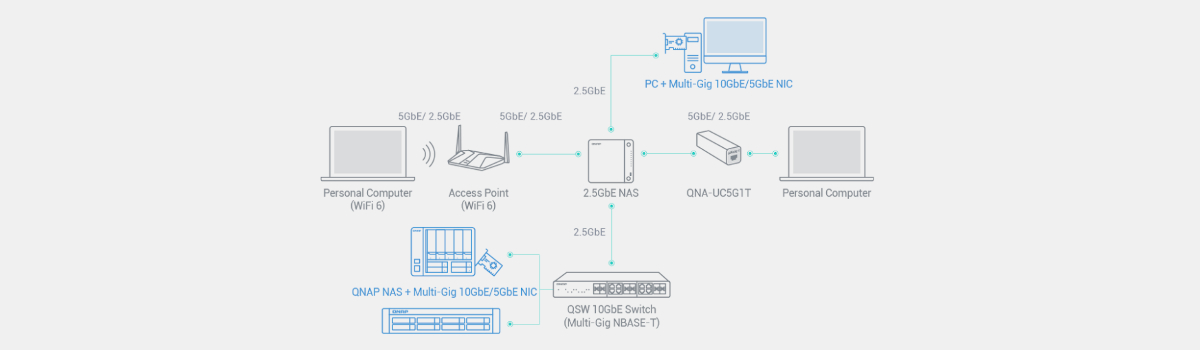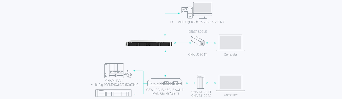 Model TS-464eU idealnie współdziała z zarządzanymi i niezarządzanymi przełącznikami 2,5GbE/10GbE firmy QNAP w celu uzyskania wysokiej szybkości, bezpiecznego środowiska sieciowego z możliwością rozbudowy, nie przekraczając budżetu. QNAP oferuje również karty PCIe 2,5GbE/5GbE/10GbE oraz adaptery USB 5GbE dla stacji roboczych z systemem Windows®/Linux®, dzięki czemu można łatwo zbudować środowisko szybkiej sieci na potrzeby produktywnej współpracy zespołowej.