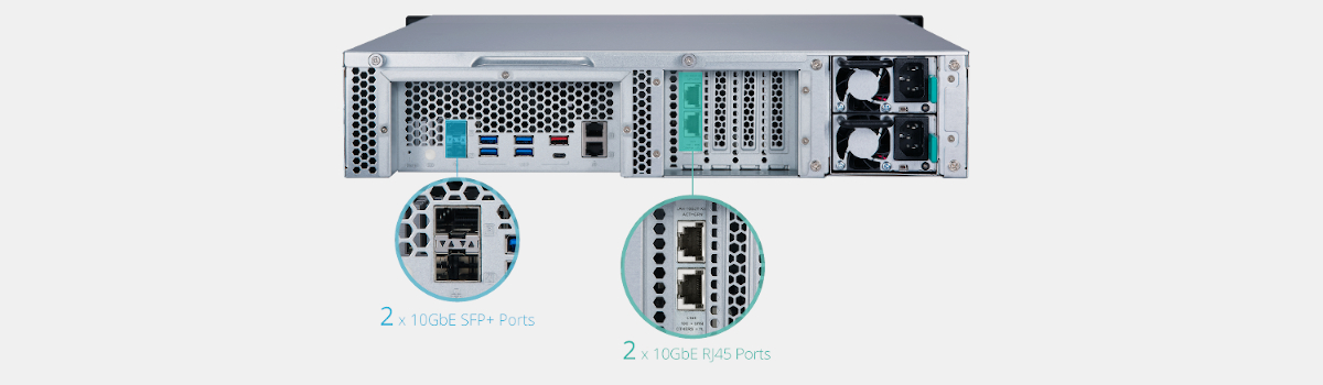 Model TS-h1277XU-RP zapewnia dwa porty Gigabit RJ45, dwa porty 10GbE SFP+ i jest fabrycznie wyposażony w kartę rozszerzeń 10GbE RJ45 z podwójnym portem, zainstalowaną w gnieździe PCIe. Wystarczająca łączność 10GbE poprawia ogólną wydajność sieci, zapewniając sprawne działanie aplikacji wymagających dużej przepustowości, np. wirtualizacji, udostępniania dużych plików i szybkiego tworzenia kopii zapasowych oraz przywracania danych.