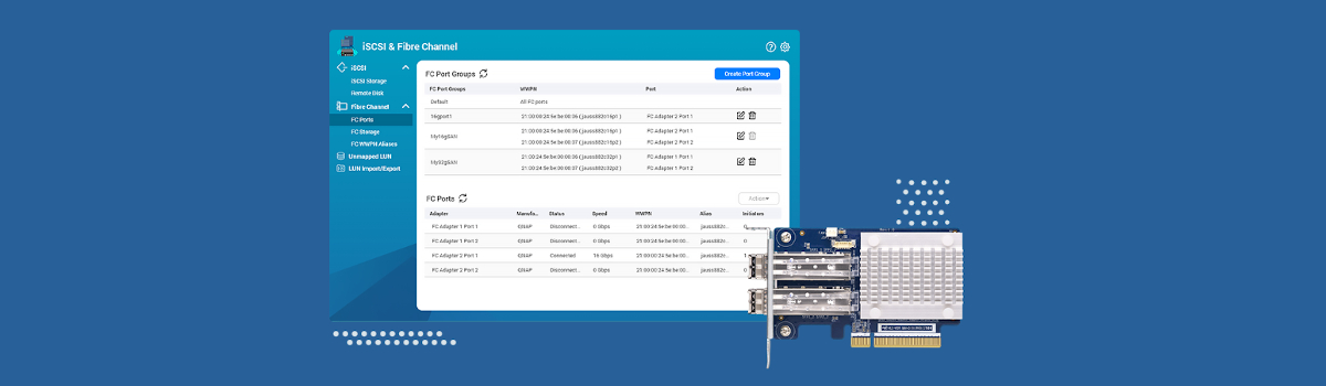 Popularne urządzenia SAN (Fibre Channel Storage Area Networks) są często kosztowne. Teraz masz dostęp do bardziej przystępnych cenowo opcji, dzięki którym w łatwy sposób dodasz NAS do środowiska SAN. Po zainstalowaniu karty Marvell®, ATTO® lub QNAP Fibre Channel w modelu TS-h1277XU-RP możesz skonfigurować miejsce docelowe Fibre Channel za pomocą aplikacji iSCSI i Fibre Channel. Ponadto funkcje Maskowania LUN i Powiązania portów zapewniają dodatkowy poziom zabezpieczenia danych.
