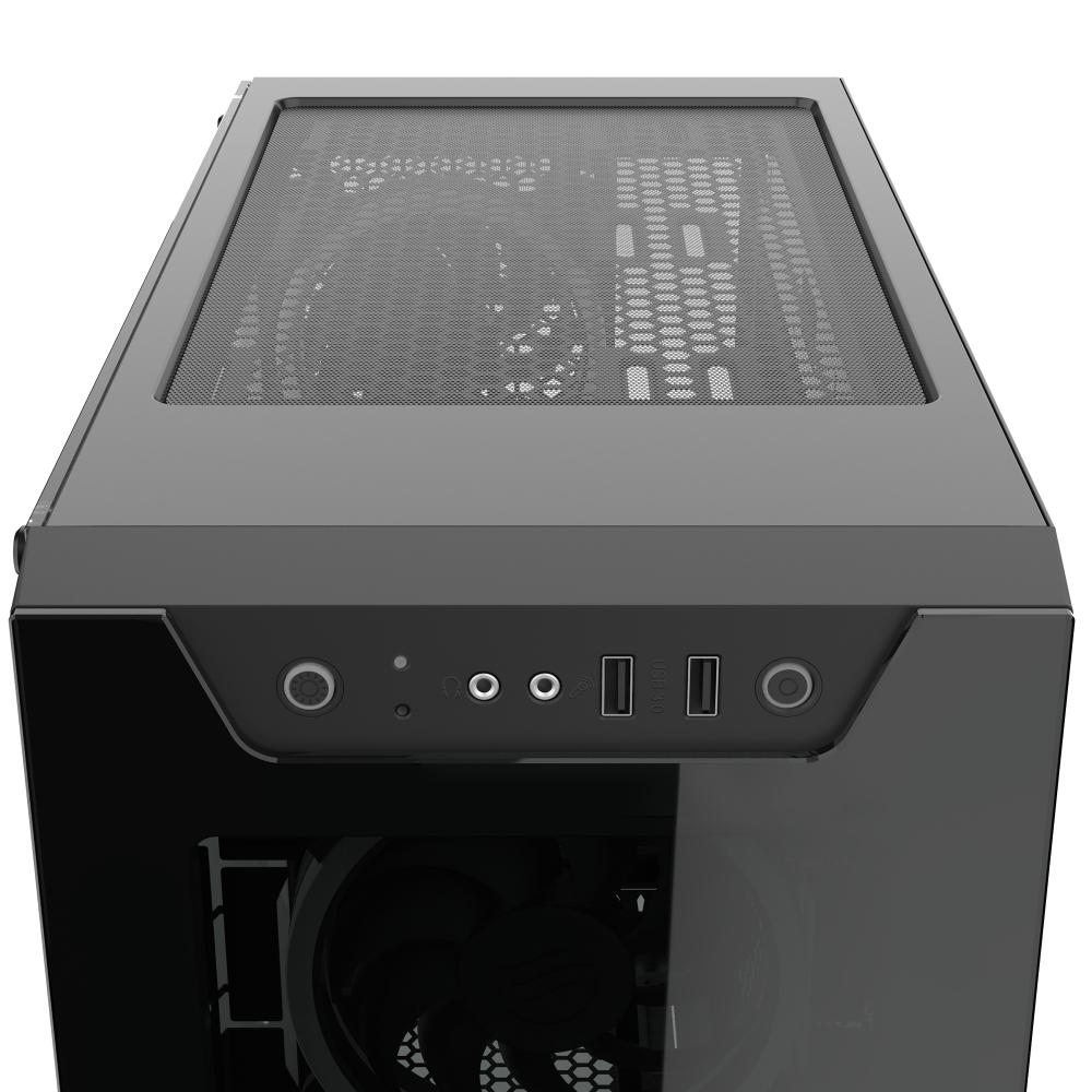 2× USB 3.1 Gen 1 (3.0) na topie obudowy, złącza dla słuchawek, mikrofonu oraz przycisk LED do zmiany koloru podświetlenia na jeden z kilkunastu trybów, m.in. pojedynczy kolor, „łagodne przejście” czy „oddech”.
