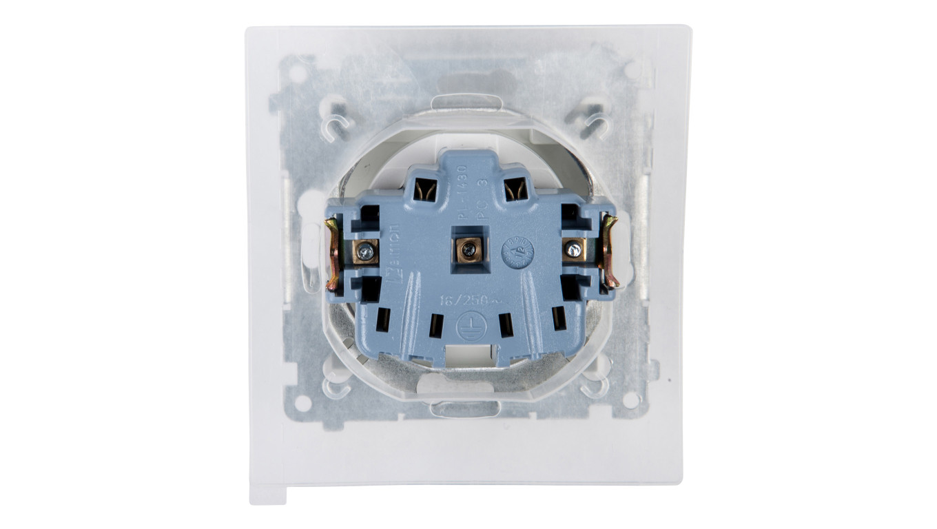 Simon 54 Gniazdo bryzgoszczelne z/u IP44 z przesłoną torów i klapką pełną białe DGZ1BZ.01/11