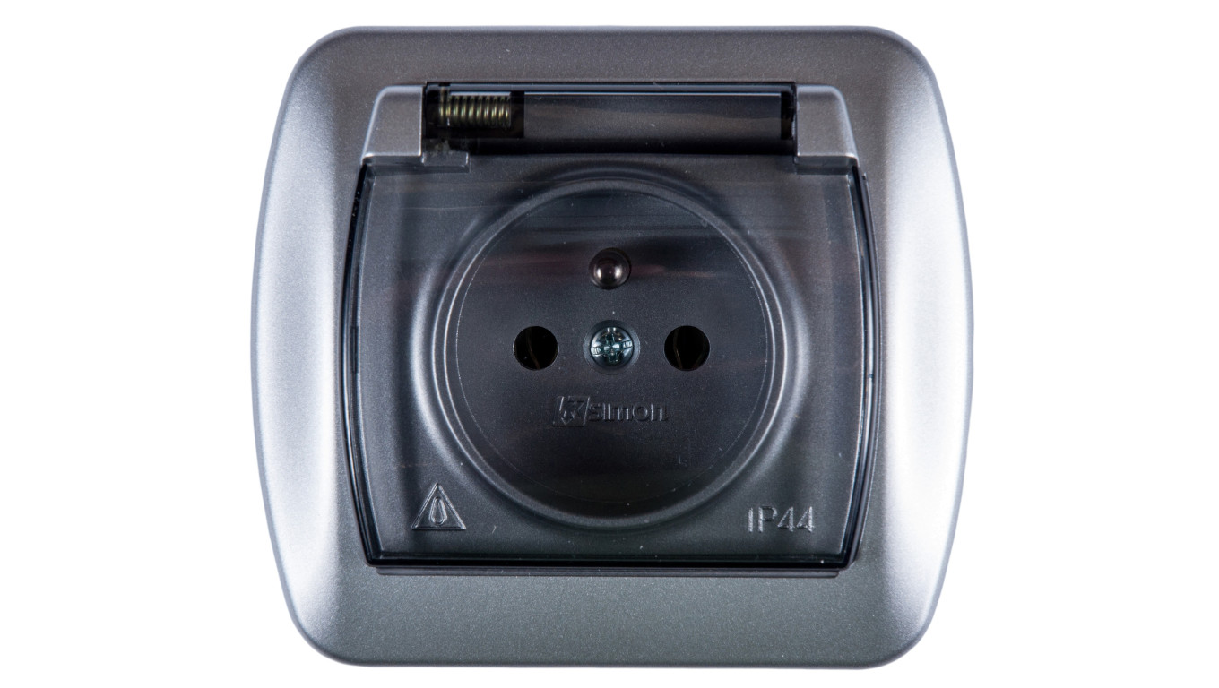 Simon Akord Gniazdo bryzgoszczelne z/u IP44 z klapką dymną aluminium metalizowane AGZ1Be/26a