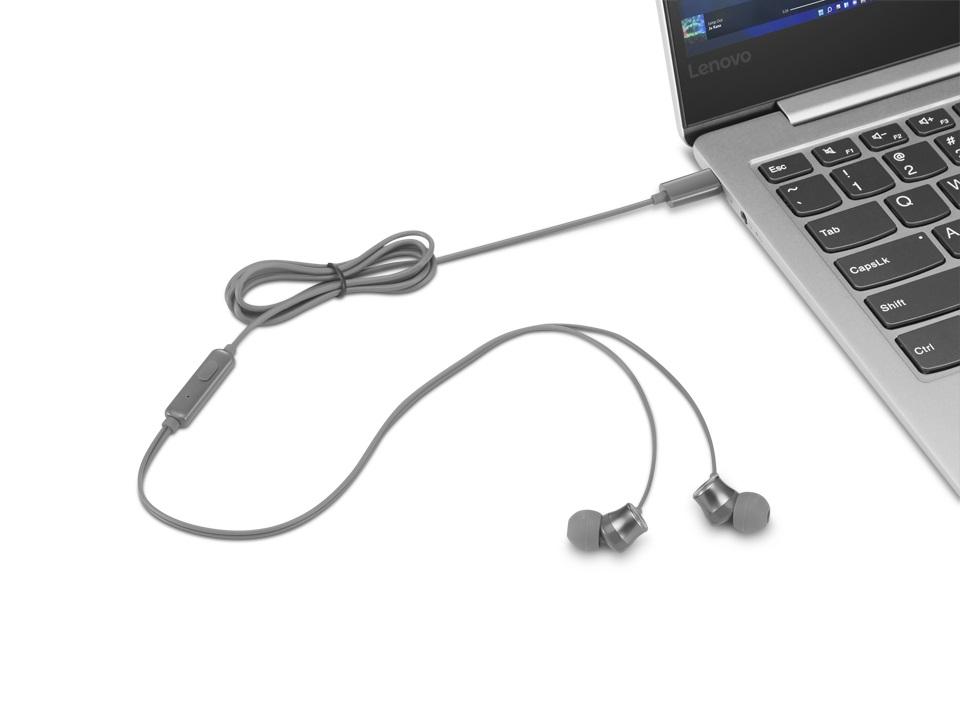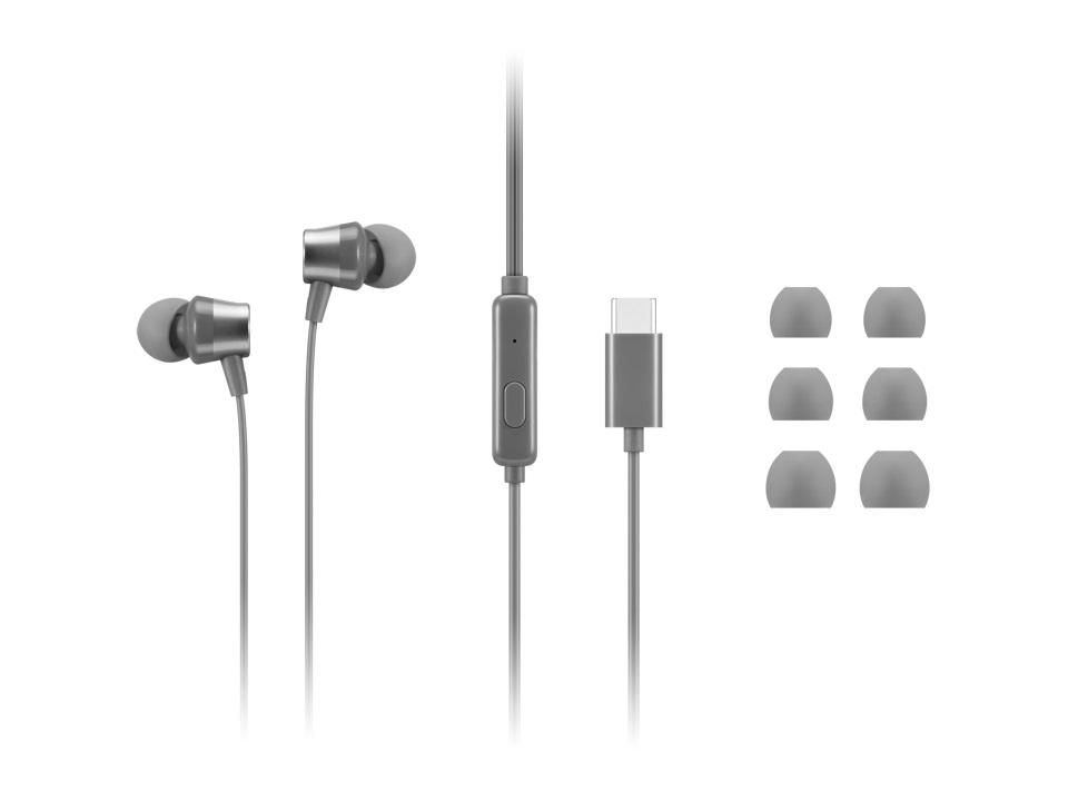 Przewodowe słuchawki douszne Lenovo 300 USB-C z technologią dźwięku cyfrowego dla mas. Jeśli lubisz spędzać dni muzykując lub rozmawiając, imponujące sterowniki 9 mm i liniowy mikrofon studyjnej jakości dołączone do tych dousznych słuchawek sprawią, że będzie to niezastąpiony zestaw. Dodaj silikonowe końcówki douszne w 3 rozmiarach, aby doświadczyć satysfakcjonujących doznań.