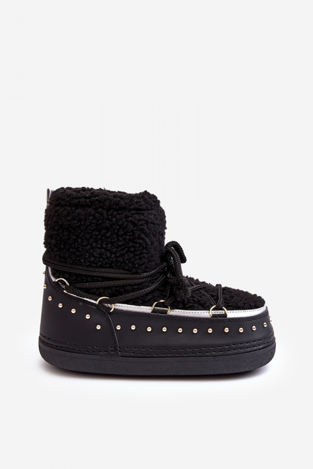 Wyjątkowe, damskie śniegowce zostały wykonane z materiału odpornego na zimno i wiatr. Cholewka ze sztucznym kożuszkiem i ćwiekami świetnie sprawdzi się w sezonie jesienno-zimowym. Model klasycznie wsuwany z dodatkowym sznurowaniem. Śniegowce zostały osadzone na masywnej platformie. Posiadają w środku ocieplenie w postaci pianki i koca obuwniczego, które zapewniają wysoką ochronę w chłodne dni.