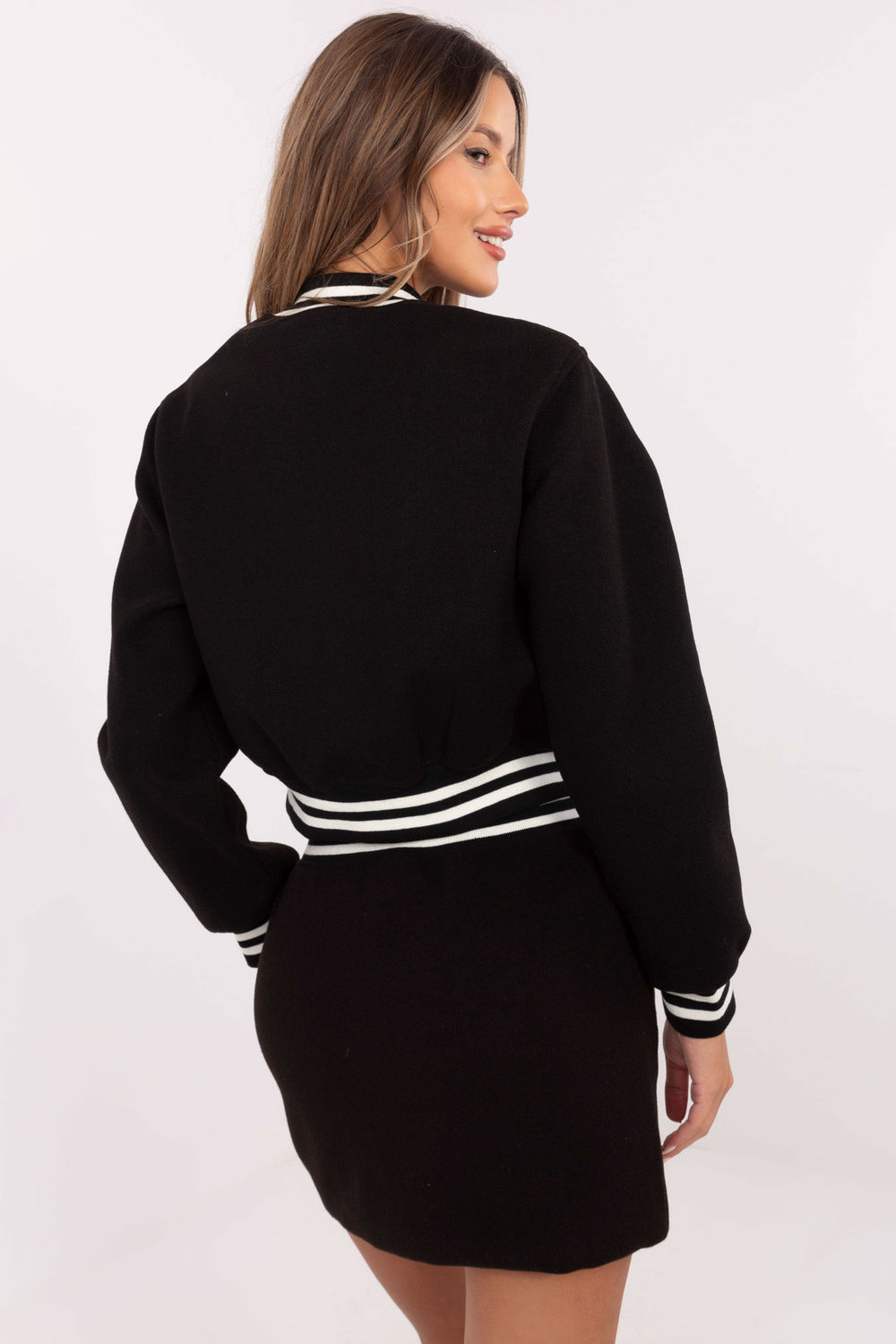 Nowoczesny i stylowy komplet damski w stylu casual, składający się z bluzy oraz spódnicy, to doskonały wybór na codzienne okazje. Wykonany z trwałego poliestru i wyposażony w podszewkę, zapewnia wygodę oraz estetyczny wygląd. Bluza o krótkiej długości ma długi rękaw, stójkę oraz kontrastowe paski na ściągaczach, które dodają jej sportowego charakteru. Boczne wsuwane kieszenie i naszywki na bluzie podkreślają nowoczesny styl. Bluza zapinana jest na guziki, co zapewnia funkcjonalność i modny wygląd. Spódnica o krótkiej długości, również z bocznymi wsuwanymi kieszeniami, harmonijnie dopełnia zestaw. Zapięcie na guziki nadaje jej eleganckiego akcentu, który świetnie komponuje się z casualowym stylem kompletu. To doskonały wybór dla kobiet ceniących komfort, uniwersalność i niebanalny design.