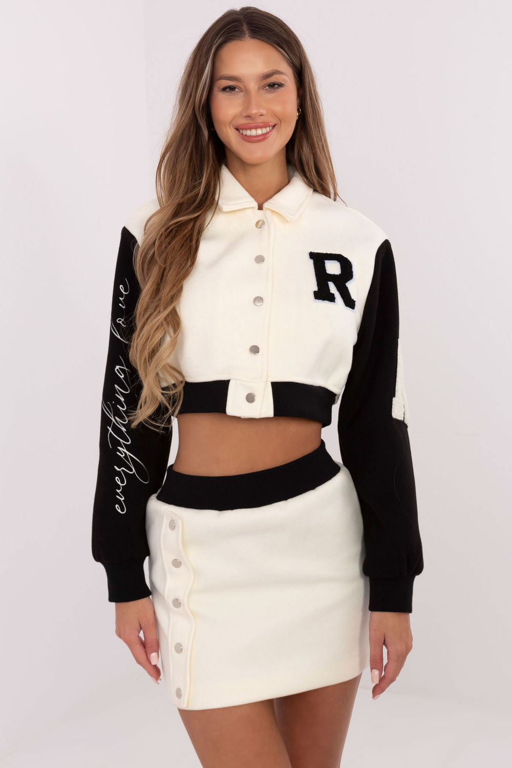 Elegancki i wygodny komplet damski w stylu casual, idealny na codzienne okazje. Wykonany z wytrzymałego poliestru z podszewką, zapewnia komfort noszenia i nowoczesny wygląd. Bluza o krótkiej długości posiada długi rękaw, stójkę oraz praktyczne zapięcie na zatrzaski, które podkreśla jej sportowy charakter. Ozdobne naszywki na rękawie i przodzie oraz haft na drugim rękawie dodają jej oryginalności. Spódnica o krótkiej długości jest wyposażona w szeroką gumę w pasie, co gwarantuje wygodne dopasowanie i podkreślenie talii. Gładki wzór kompletu nadaje mu uniwersalności, idealnie pasując zarówno do minimalistycznych, jak i bardziej wyrazistych stylizacji. To praktyczny i modny zestaw dla kobiet, które chcą łączyć wygodę z wyrazistym designem.