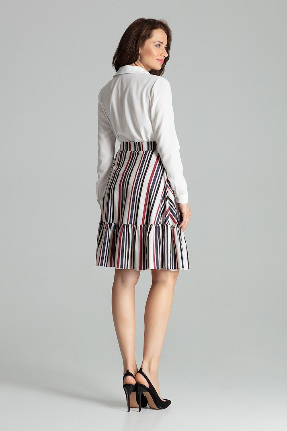 Rozkloszowana spódnica w paski za kolano z ozdobną falbaną w dolnej części. Zapinana z boku na kryty zamek. Spódnica bez podszewki i bez kieszeni.