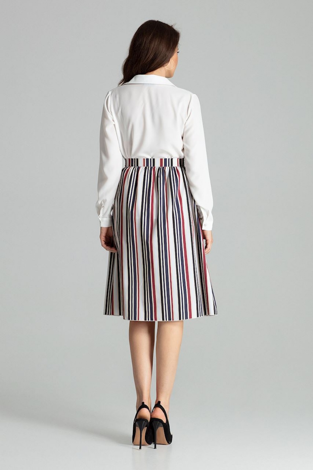 Spódnica midi w paski marszczona w pasie, zapinana na boczny kryty zamek. Kopertowy przód spódnicy. Z przodu pasek z ozdobną metalową klamrą w kolorze złotym. Sukienka bez podszewki i bez kieszeni.