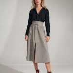 Długa spódnica wykonana z delikatnego materiału z zapięciem w pasie doskonale podkreśla kobiecą figurę. Dodatkowego uroku dodają dwa widoczne guziczki w pasie.