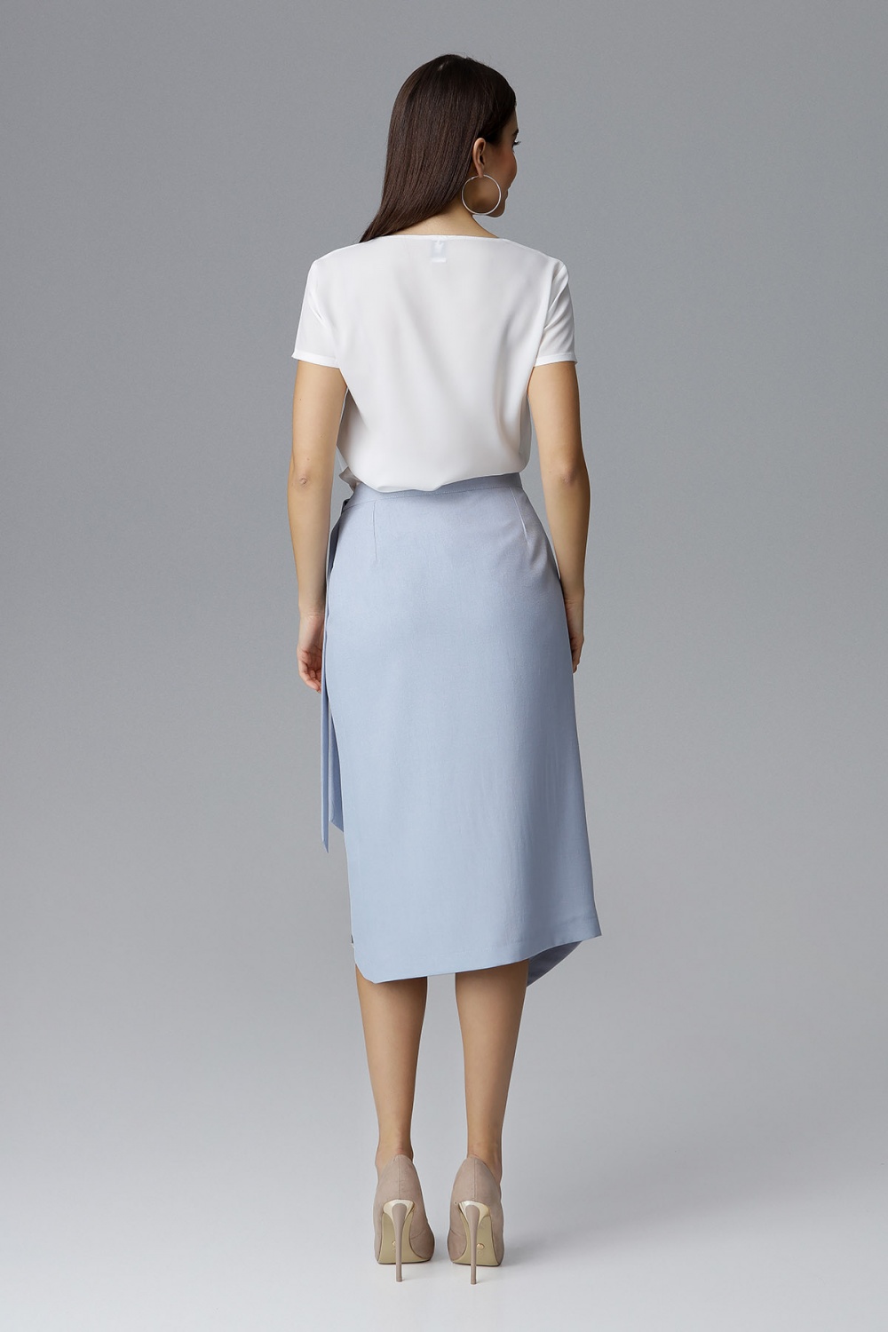 Asymetryczna spódnica, zakładana na lewy bok z wiązaniem w pasie. Idealnie skomponuje się do szpilek, botków czy kozaków.