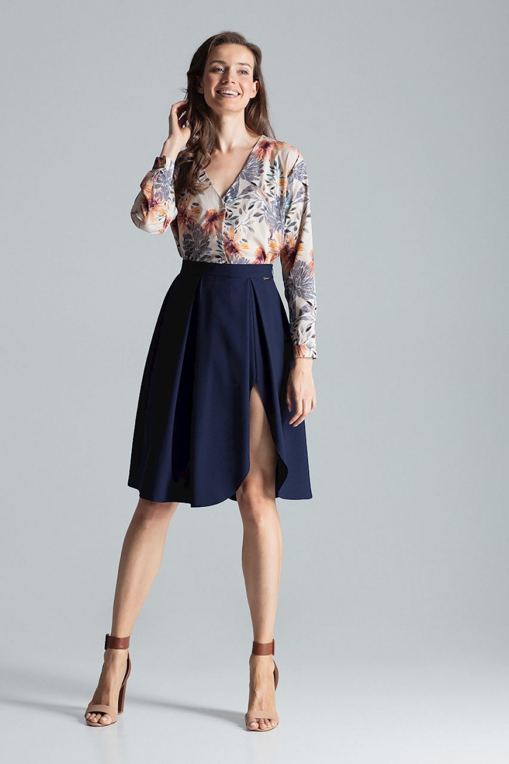 Granatowa spódnica midi w kontrafałdy, bez kieszeni, bez podszewki, typu A, zapinana z boku na suwak. Na lewej nodze, asymetryczne, eleganckie rozcięcie.
