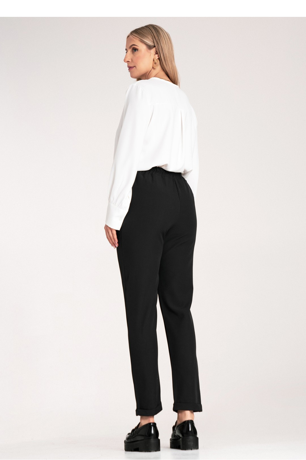 Eleganckie spodnie o dopasowanym kroju z podwiniętymi nogawkami. Wysoki stan z elastycznym pasem zapewnia komfort, a subtelne zaszewki podkreślają sylwetkę. Spodnie posiadają kieszenie wsuwane.