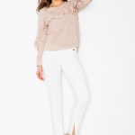 Proste spodnie damskie o dopasowanym kroju. Spodnie zapinane na boczny zamek. U dołu nogawki z rozcięciami.