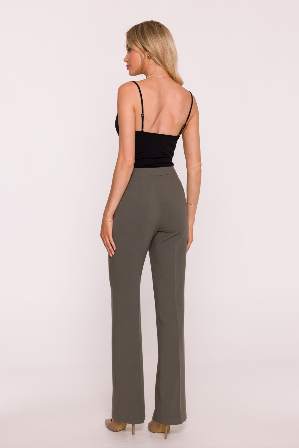 Klasyczne spodnie damskie wykonane z gładkiej tkaniny o miękkim wykończeniu. Fason garniturowy, dopasowany w talii i biodrach, z prostymi, długimi nogawkami zaprasowanymi na kant, które wysmuklają sylwetkę i dodają elegancji. Model posiada średni stan oraz praktyczne boczne kieszenie. Zapięcie z przodu na guzik i kryty zamek gwarantuje wygodę i estetyczne wykończenie. Brak podszewki sprawia, że spodnie są lekkie i komfortowe w noszeniu. Ponadczasowy krój sprawdzi się zarówno w stylizacjach biznesowych, jak i w bardziej formalnych zestawach. Zaprojektowano i uszyto w Polsce.
