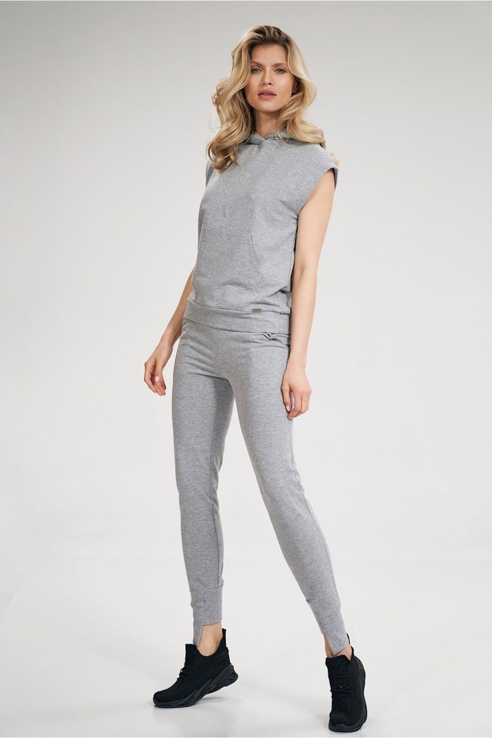Dresowe bawełniane spodnie z asymetrycznym ściągaczem na dole nogawki. Z kieszeniami, w pasie szeroka guma.