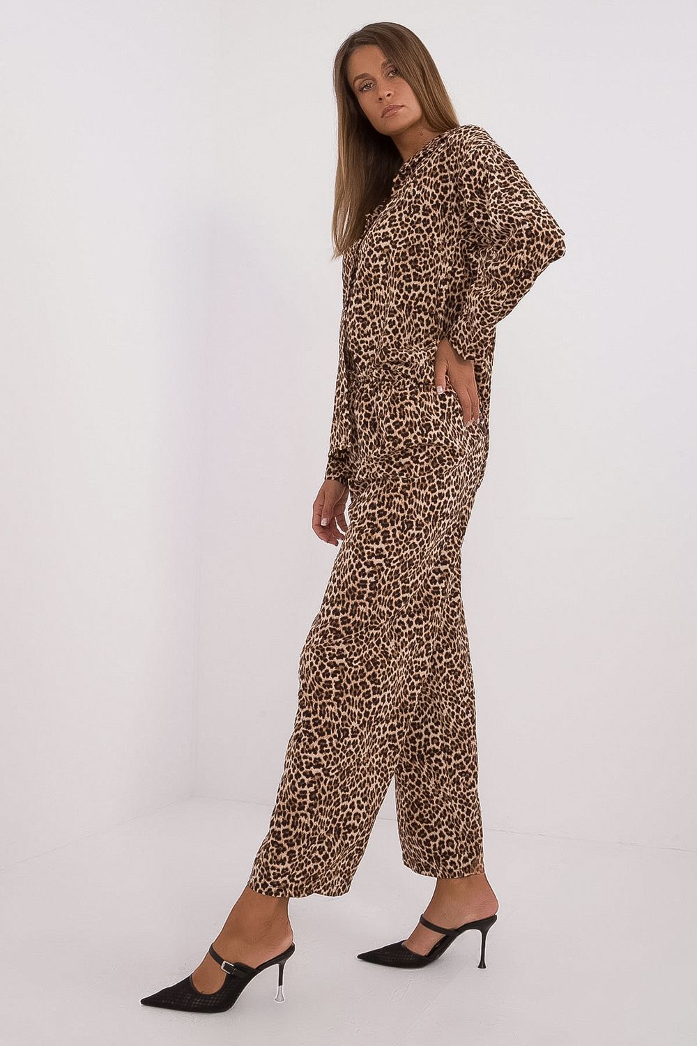 Damski komplet o modnym zwierzęcym motywie, składający się z koszuli i spodni, wykonany z połączenia poliestru i elastanu. Koszula ma długi rękaw i jest zapinana na guziki, co nadaje jej klasycznego charakteru. Dodatkowo wyposażona jest w kołnierzyk, który podkreśla elegancki wygląd. Spodnie są długie, z szerokimi nogawkami, które zapewniają wygodę i swobodę ruchów. Wysoki stan spodni pięknie podkreśla sylwetkę, dodając całości wyrafinowania. Ten komplet to idealny wybór dla kobiet ceniących modę, komfort i odrobinę drapieżnego stylu na co dzień.